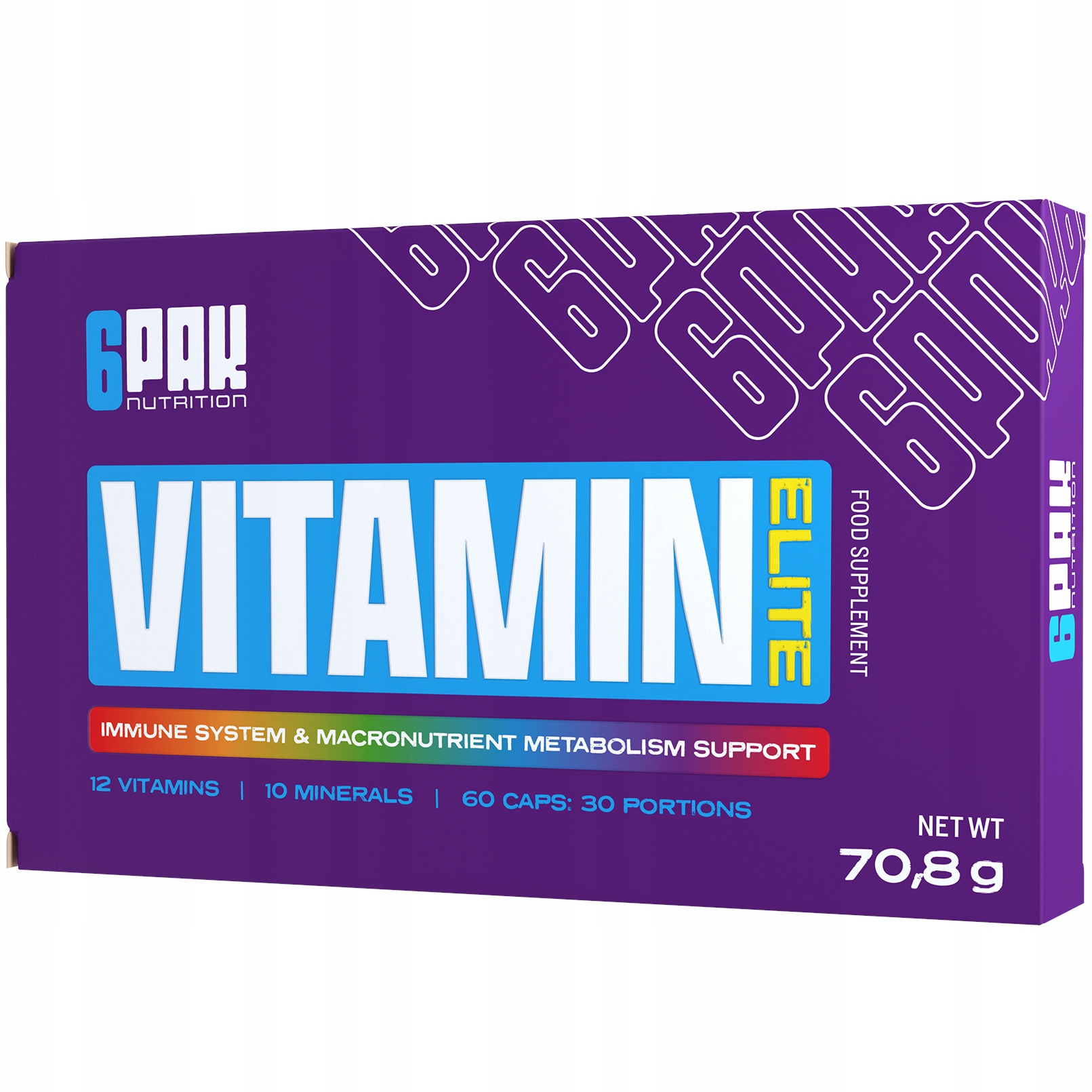 6PAK Nutrition VITAMIN ELITE - wysokiej klasy suplement stworzony celem zaspokojenia potrzeb najbardziej wymagających sportowców, których ambicją jest ciągłe pokonywanie kolejnych barier i własnych ograniczeń. Nie byłoby to możliwe bez zaspokojenia najbardziej podstawowych potrzeb organizmu. Warto podkreślić, że odpowiednia podaż witamin oraz minerałów przekłada się na utrzymanie pełnej sprawności organizmu, zarówno w kontekście sportowym, jak i codziennego funkcjonowania. Przykładowo witamina C oraz cynk wpływają pozytywnie na funkcjonowanie układu odpornościowego, który często jest osłabiany przez wytężony wysiłek fizyczny. Natomiast prawidłowy przebieg przemian metabolicznych wspierany jest przez chrom oraz witaminy z grupy B, podczas gdy przemiany energetyczne przez witaminy z grupy B, żelazo, mangan. Oczywiście nie można zapominać o antyoksydacyjnym potencjale zawartych w składzie mikroelementów, których wpływ na ochronę komórek przed zniszczeniem w wyniku stresu oksydacyjnego jest olbrzymi (cynk, witamina C, mangan, miedź, witamina E, selen). Formuła została odpowiednio skomponowana - nie ma w niej miejsca na przypadki i kompromisy.