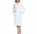 Гостиничный халат белого цвета с воротником-шалью. Халат был изготовлен из 100% хлопчатобумажная махровая ткань 400 г/м2. Халат приятный и мягкий на ощупь и тот факт, что по структуре напоминает традиционное полотенце, оно очень хорошо впитывает лишнюю воду.