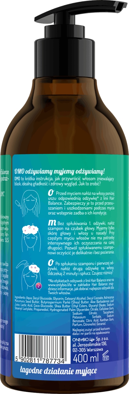 Aloes tonizuje skórę głowy, nawilża ją, koi podrażnienia i pomaga przywrócić naturalne PH, a bogate w witaminy A i E oraz kwasy Omega 3 i 6 masełko murumuru odżywia, regeneruje i nawilża włosy i skórę głowy.