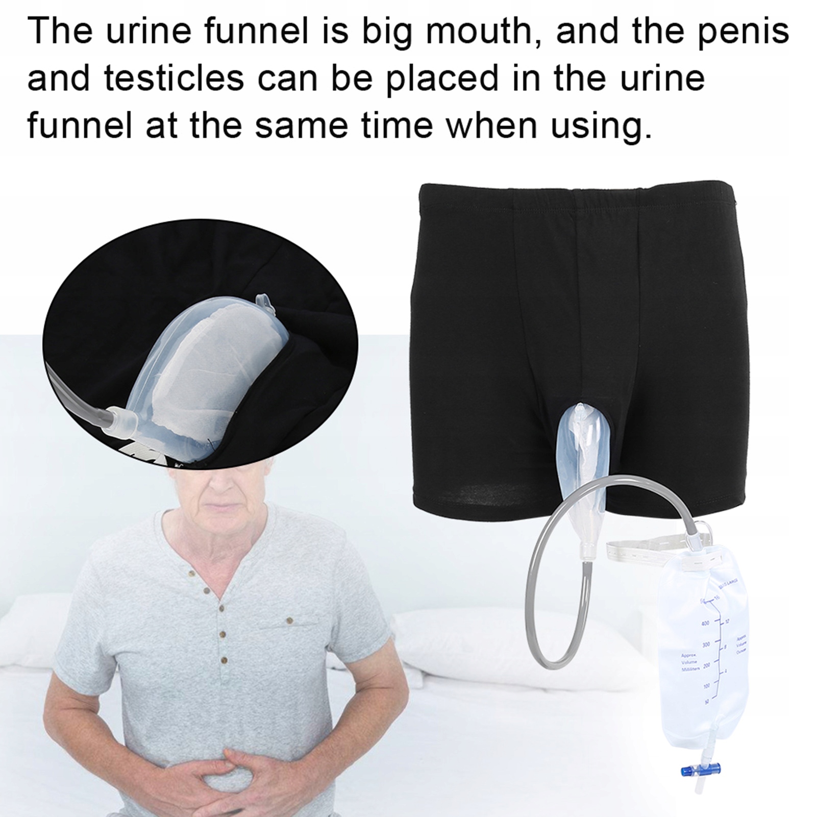 Ten produkt jest odpowiedni do demencji i nietrzymania moczu dla starszych mężczyzn do noszenia podczas chodzenia. Przyjęcie wysokiej jakości medycznego materiału silikonowego będzie bezpieczne i zdrowe. Jego rozsądna konstrukcja sprawia, że jest bardzo wygodny i wygodny w użyciu. W zestawie dwa worki na mocz o pojemności 500 ml. Wspaniała pomoc dla pacjentów płci męskiej z nietrzymaniem moczu.
