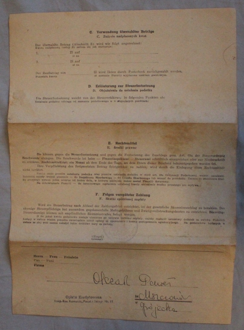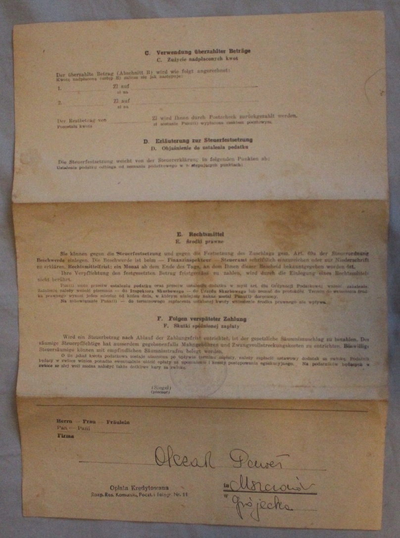 ZAPRASZAM DO KUPNA STAREGO DOKUMENTU - FINANZINSPEKTEUR - INSPEKTOR SKARBOWY, STEUERAT - URZĄD SKARBOWY - Żyrardów 1943 rok, MSZCZONÓW. DOKUMENT POCHODZI Z MOJEJ PRYWATNEJ KOLEKCJI. STAN WIDOCZNY NA ZDJĘCIU.