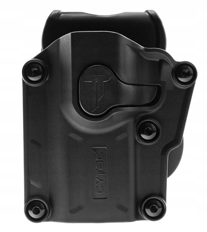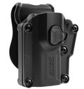 KABURA CYTAC CY-UHFSL wykonana z odpornego polimeru regulacja za pomocą śrub umożliwia dopasowanie do większości pistoletów blokada w formie przycisku pod palcem wskazującym przeznaczona dla osób leworęcznych montaż do pasa za pomocą płetwy
