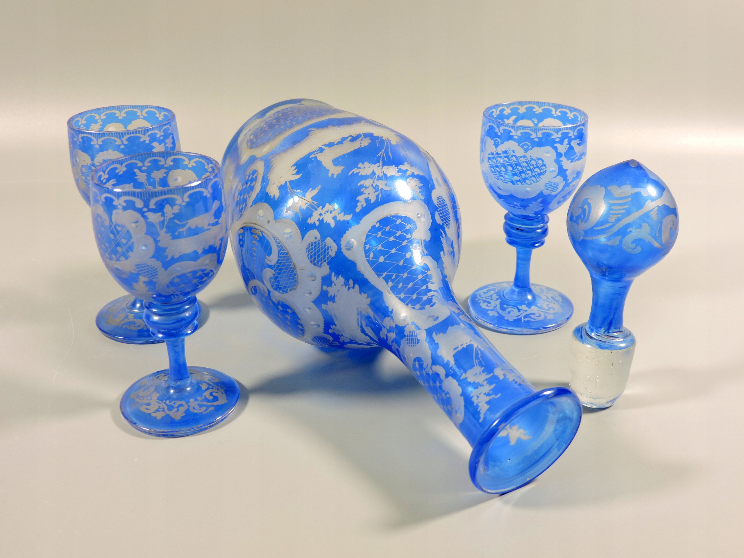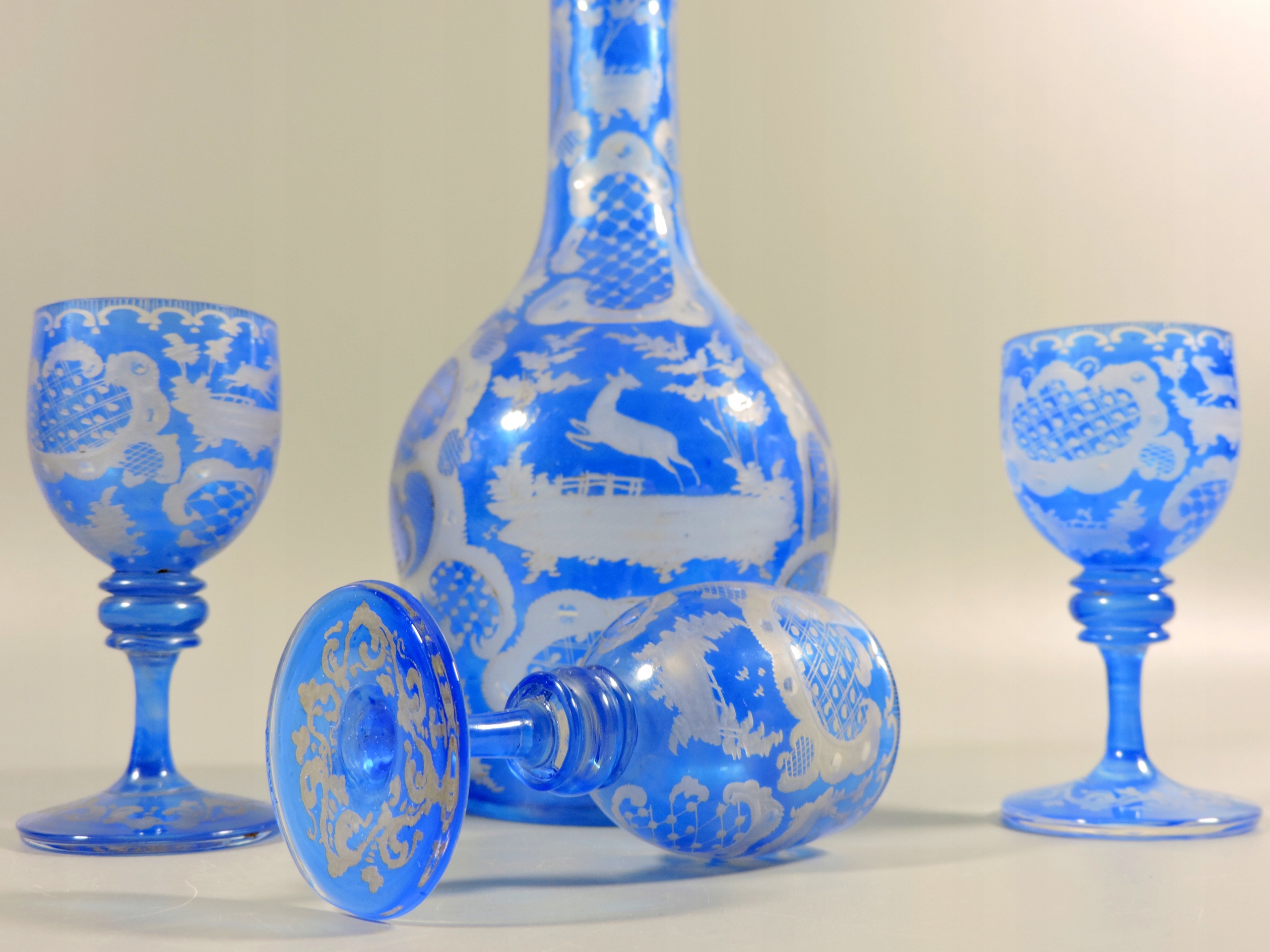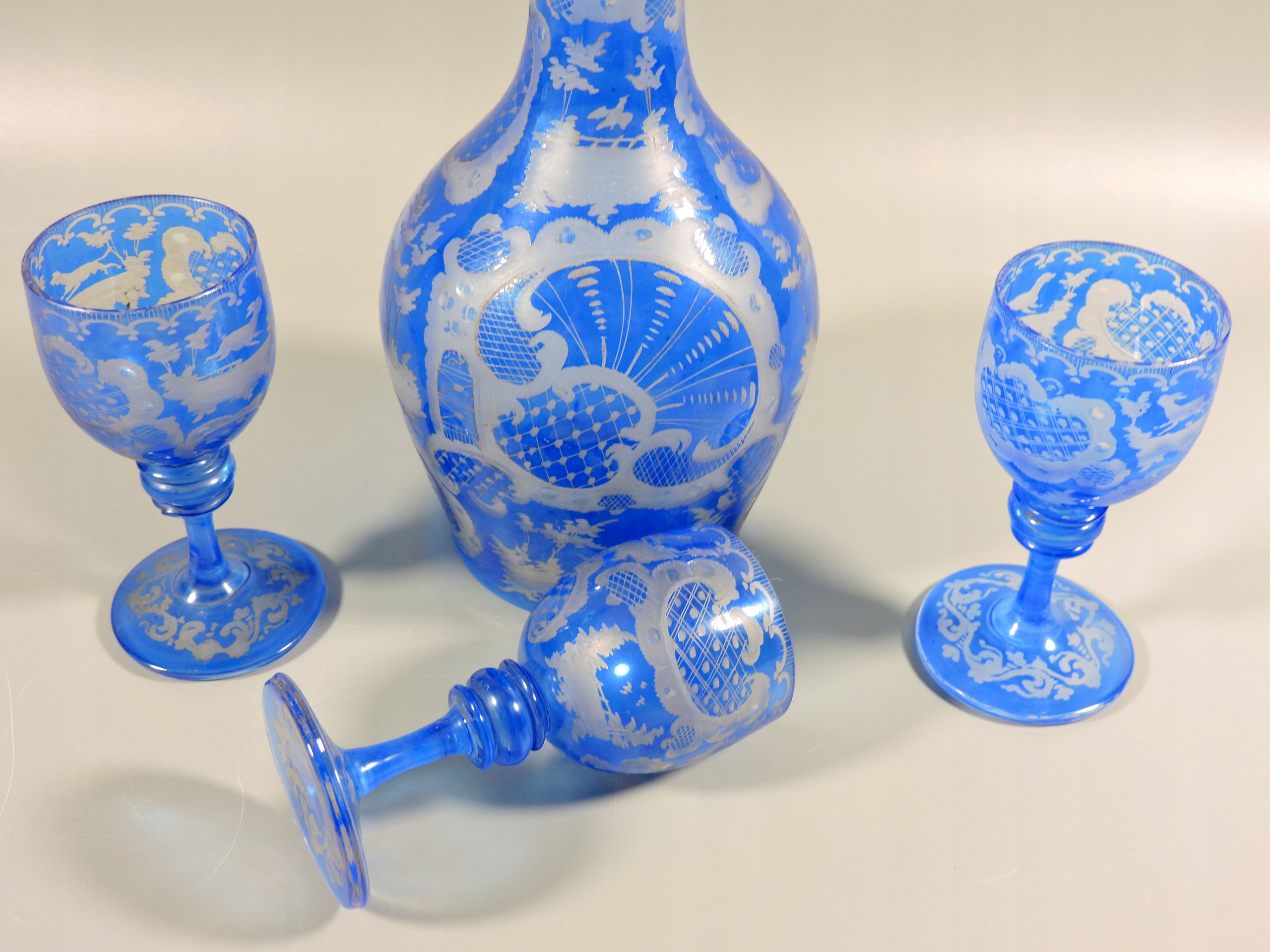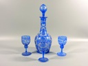 Zestaw, komplet: wspaniała zabytkowa karafka i trzy kieliszki na nóżce