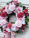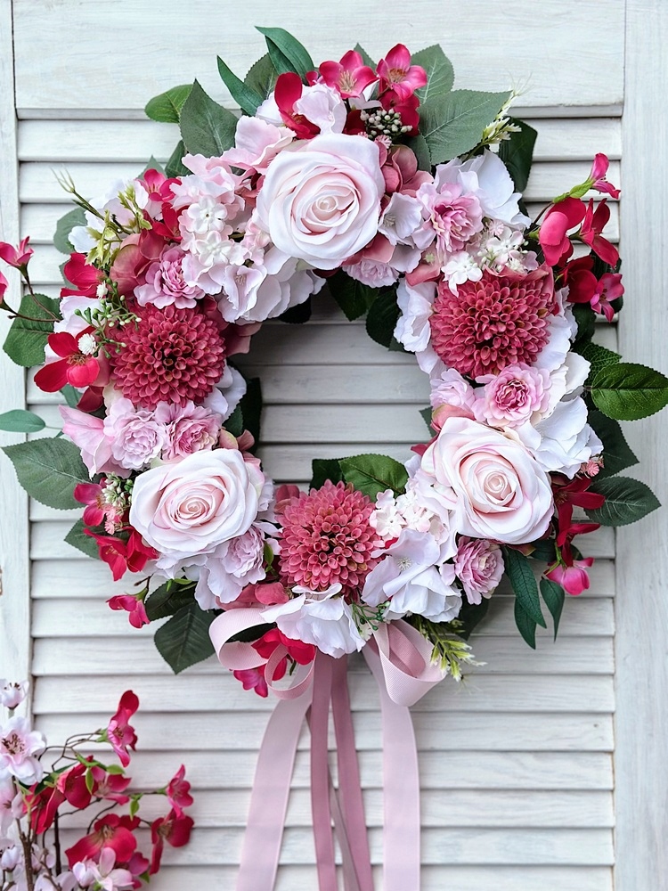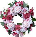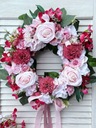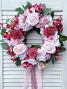 Wianek kwiatowy, ozdobiony sztucznymi kwiatami w jasnych, różowych i białych odcieniach oraz różnorodnymi dodatkami i kokardką