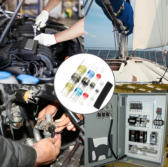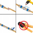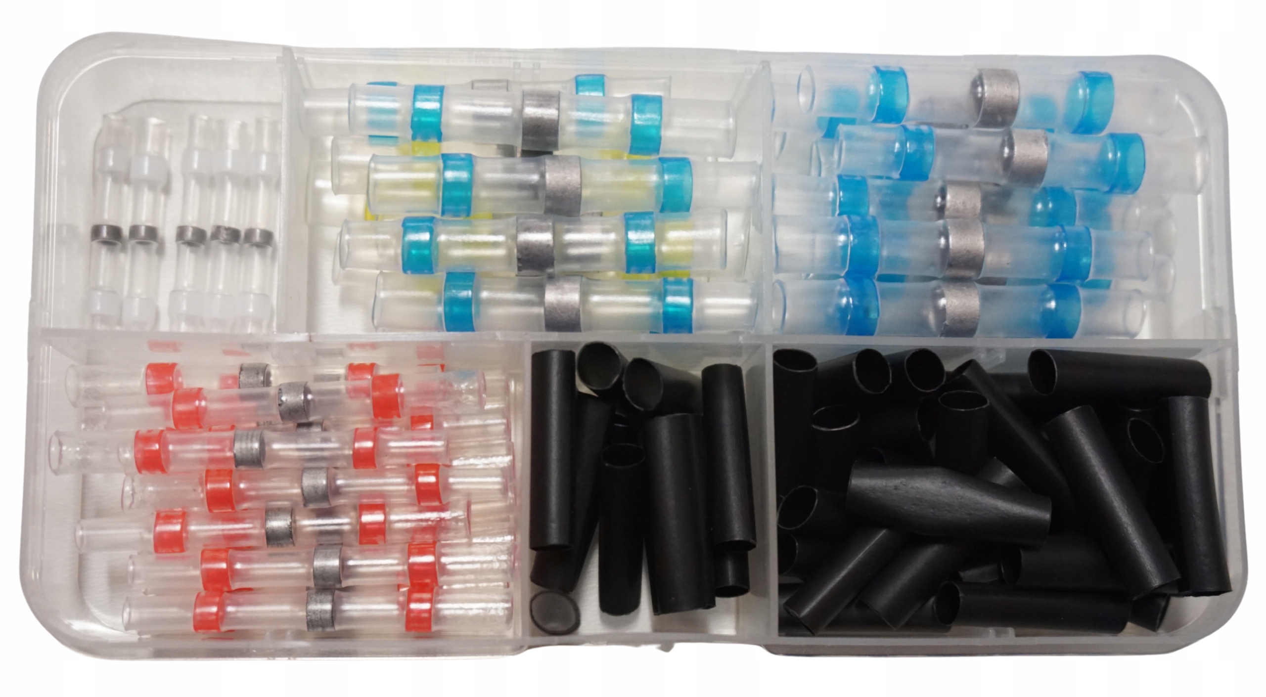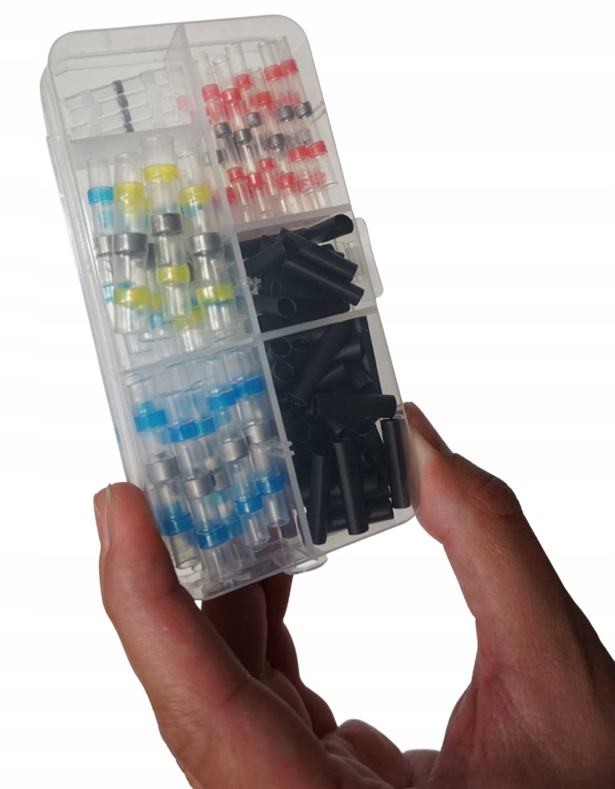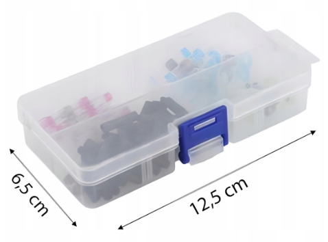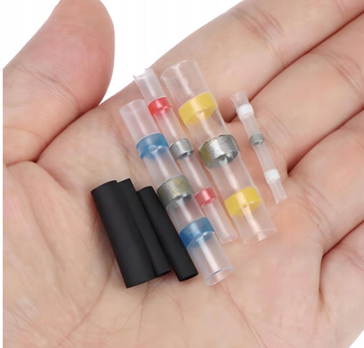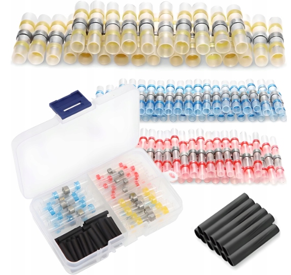 Zestaw w podręcznym pudełku szybkozłączek z cyną w rurce termokurczliwej do naprawy i łączenia przewodów. Złączki do kabli wykonane są z cyny lutowniczej, koszulki termokurczliwej oraz termoplastycznego kleju. Za trwałe połączenie żył odpowiada cyna, która roztapiając się łączy i zapewnia pewny styk żył. Klej termoplastyczny zapewnia szczelność i izolację połączenia. Całość połączenia w tego rodzaju złączce kablowej dokonuje się w tym samym czasie, przezroczysta rurka termokurczliwa umożliwia stałą kontrolę podczas procesu łączenia żył.