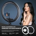 【Łagodniejsze światło i poprawa konturu twarzy】 Dzięki 320 wysokiej jakości diodom LED, precyzyjnie regulowanej jasności (0%–100%) i temperaturze barwowej (2900K–7000K), to światło pierścieniowe zapewnia oświetlenie wolne od migotania i olśnienia. Miękka płyta świetlna tworzy delikatny blask, który podkreśla odcień skóry i nadaje oczom czarujące akcenty. Osiągnij do 3300 Lux przy 0,5 m dla równomiernego oświetlenia bez cieni. CRI97+/TLCI98 dostarcza realistyczne kolory