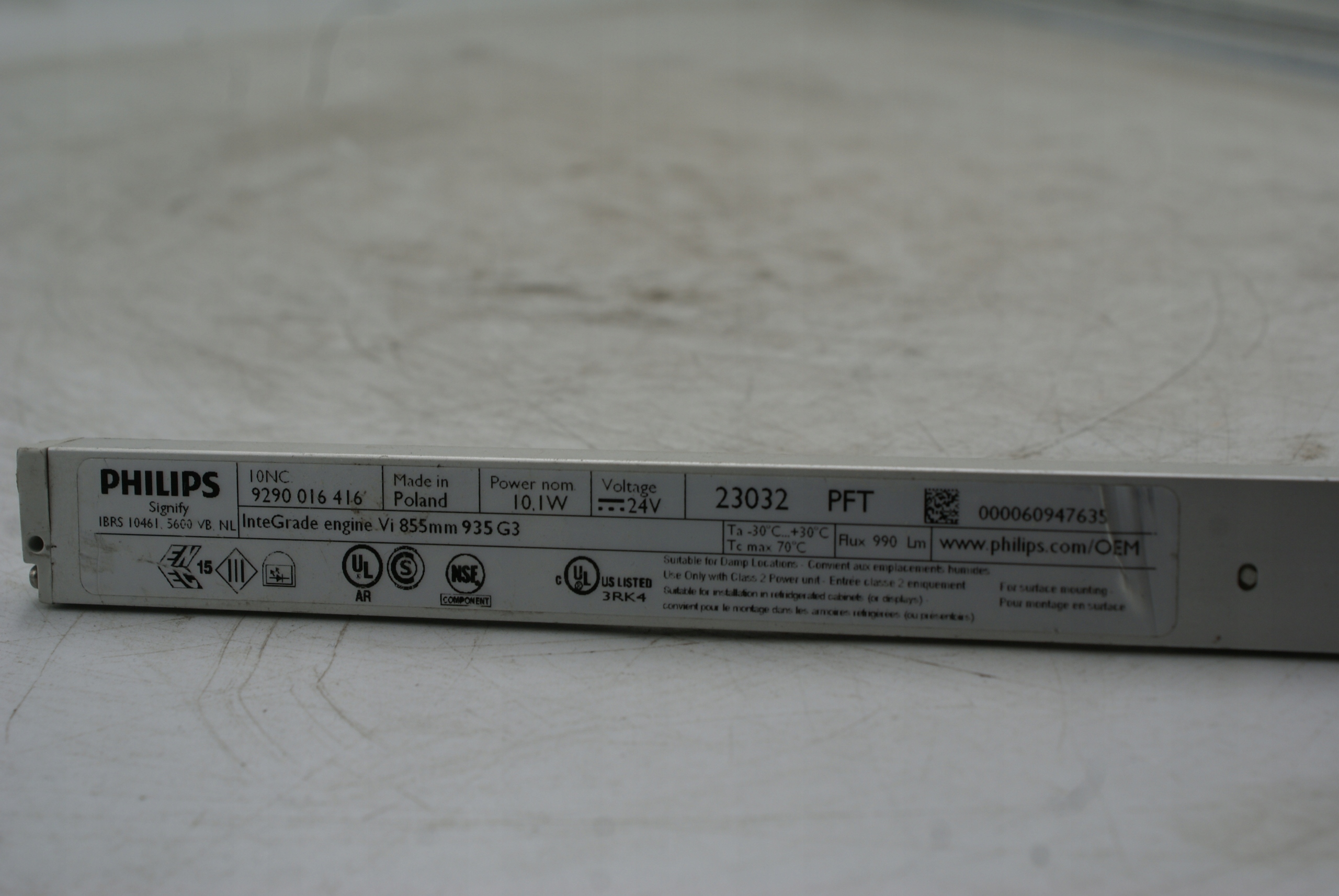 Moduł LED InteGrade engine UB Vi 855mm 935 G3 zapewnia równomierne i intensywne oświetlenie, idealne do ekspozycji produktów w chłodniach i witrynach sklepowych. Dzięki wysokiemu wskaźnikowi oddawania barw (CRI 90) produkty prezentują się naturalnie i atrakcyjnie dla klientów.