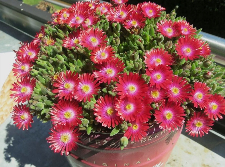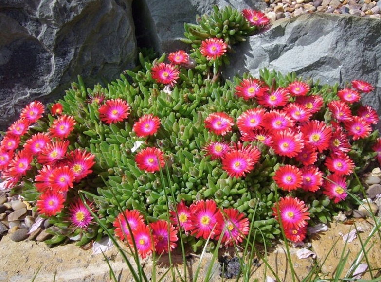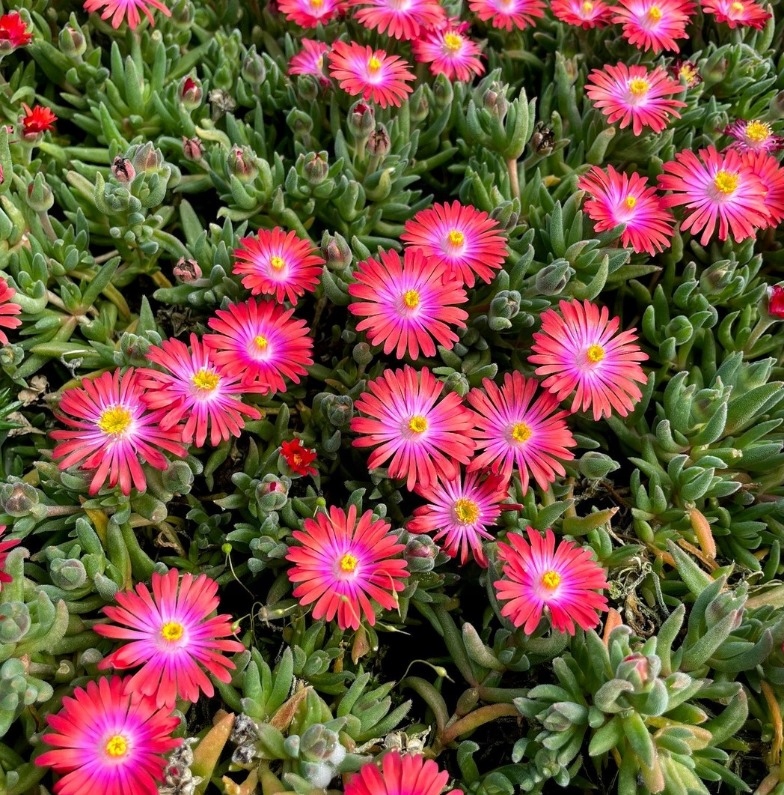 Słonecznica Delosperma cooperi z serii 'Jewel of Desert' to prawdziwy klejnot wśród roślin ogrodowych! Tworzy gęste, niskie kobierce z drobnych, mięsistych liści, które doskonale znoszą suszę. Największe wrażenie robią jednak intensywnie kolorowe kwiaty, przypominające miniaturowe słoneczka – rozwijają się masowo i zamykają tylko na noc.