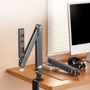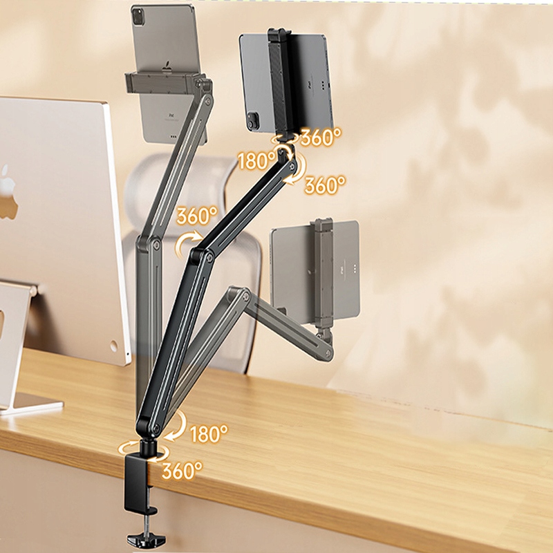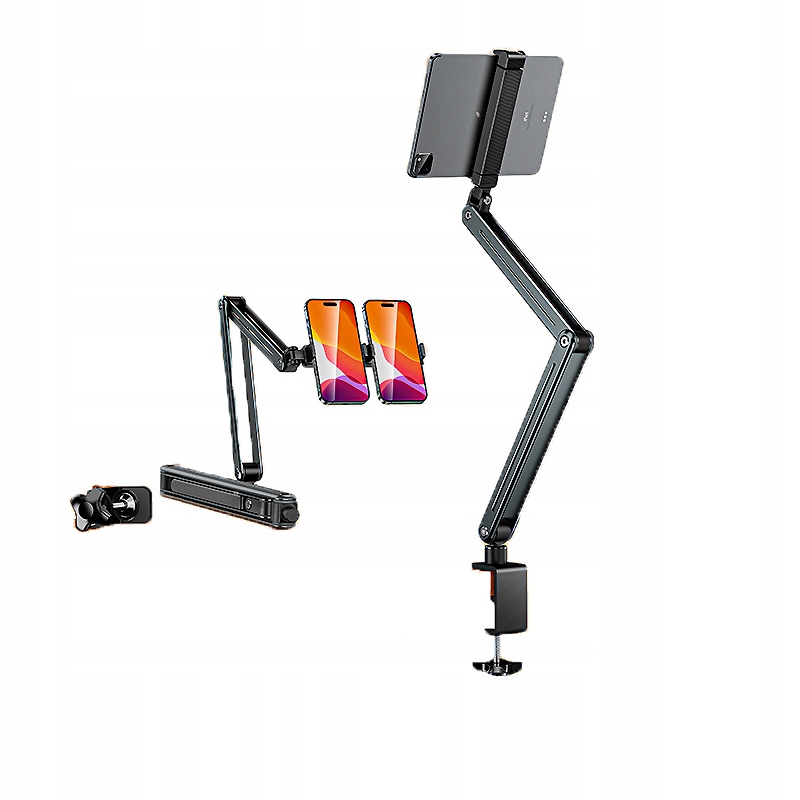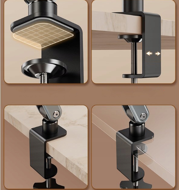 Wzmocniona konstrukcja z elastycznymi silikonowymi uchwytami, grubą metalową ramą i aluminiową podstawą chroni urządzenie przed zarysowaniami. Bezpiecznie zamocujesz go na biurku, stole, łóżku czy blacie kuchennym (maks. grubość 60 mm).