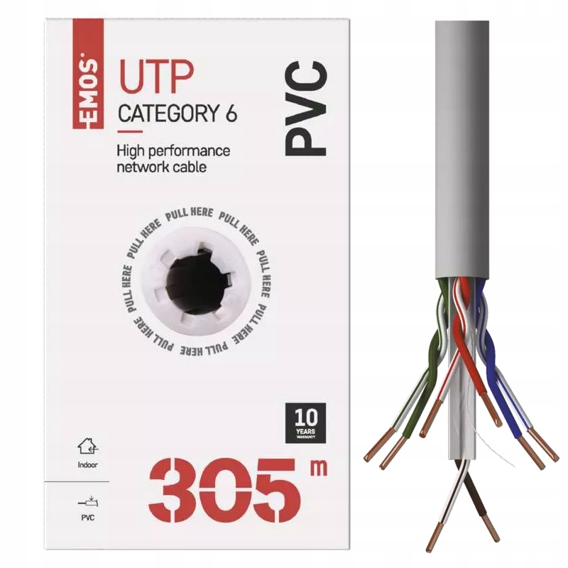 Nieekranowany przewód do okablowania poziomego o najwyższej jakości kategorii CAT6 z płaszczem PCV. Żyły przewodu zostały wykonane z miedzi wolnej od recyklingu. Przewód spełnia wymagania dyrektywy CPT o wyrobach budowlanych.