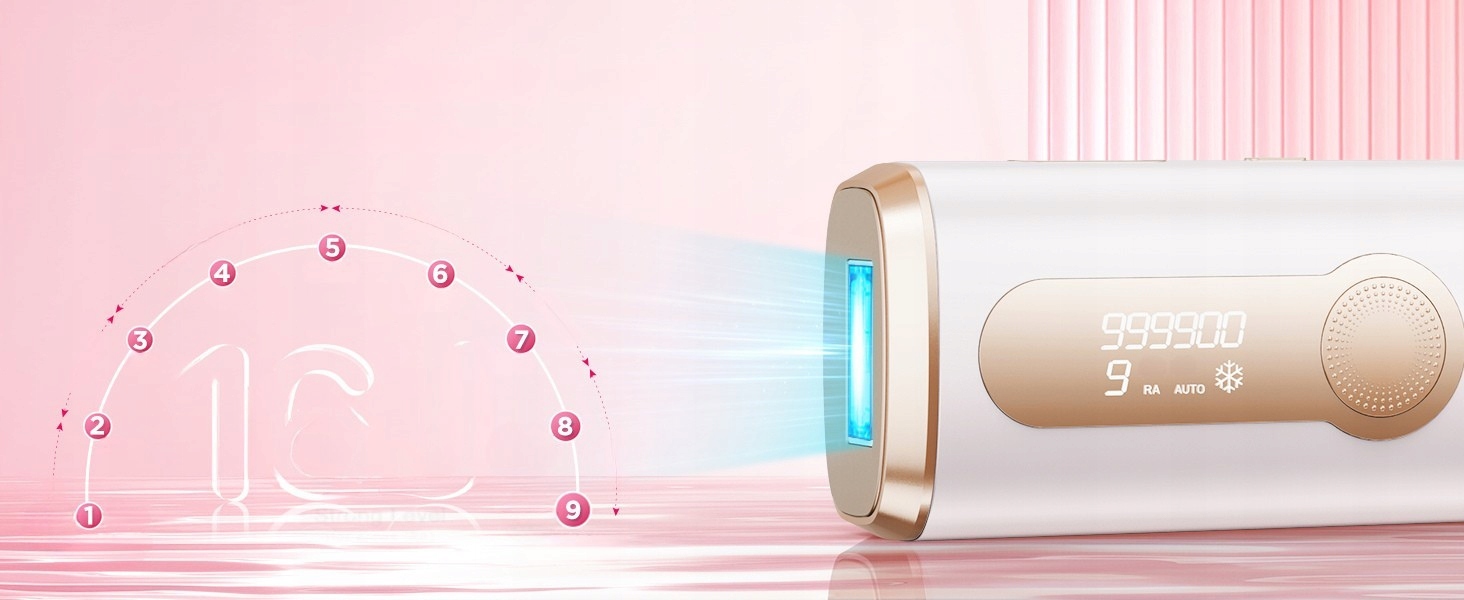 9 poziomów intensywności umożliwia dopasowanie mocy do wrażliwości skóry i depilowanej partii ciała.