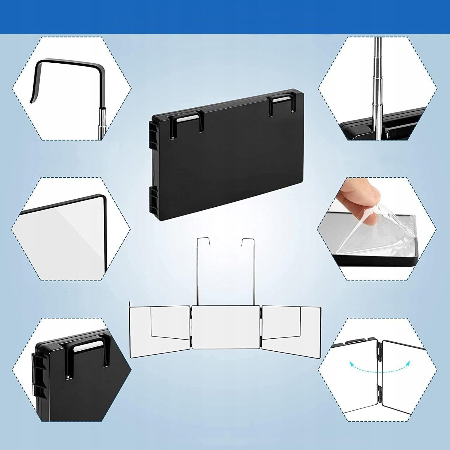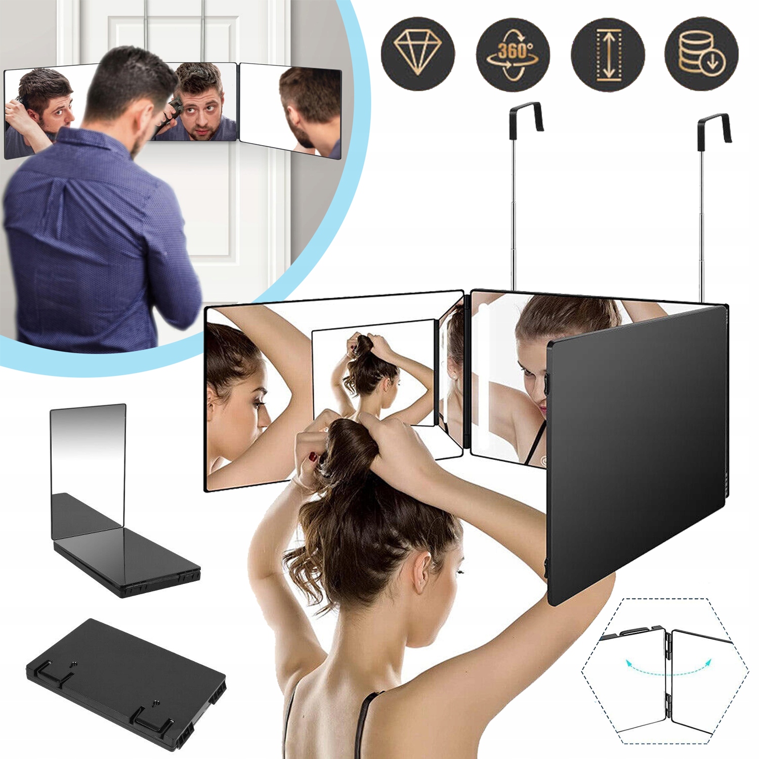 🪞 Hak z regulacją wysokości: 3-stronne lusterko jest wyposażone w regulowane haki, które umożliwiają ustawienie idealnej wysokości dla Twoich potrzeb w zakresie strzyżenia. Rozciągliwy hak można zawiesić na drzwiach, ścianach, łazienkach, szafkach lub stołach, a jego wysokość można regulować, aby dopasować go do różnych scenariuszy. A hak jest tak mocny, że może stabilnie podtrzymywać całe lustro.