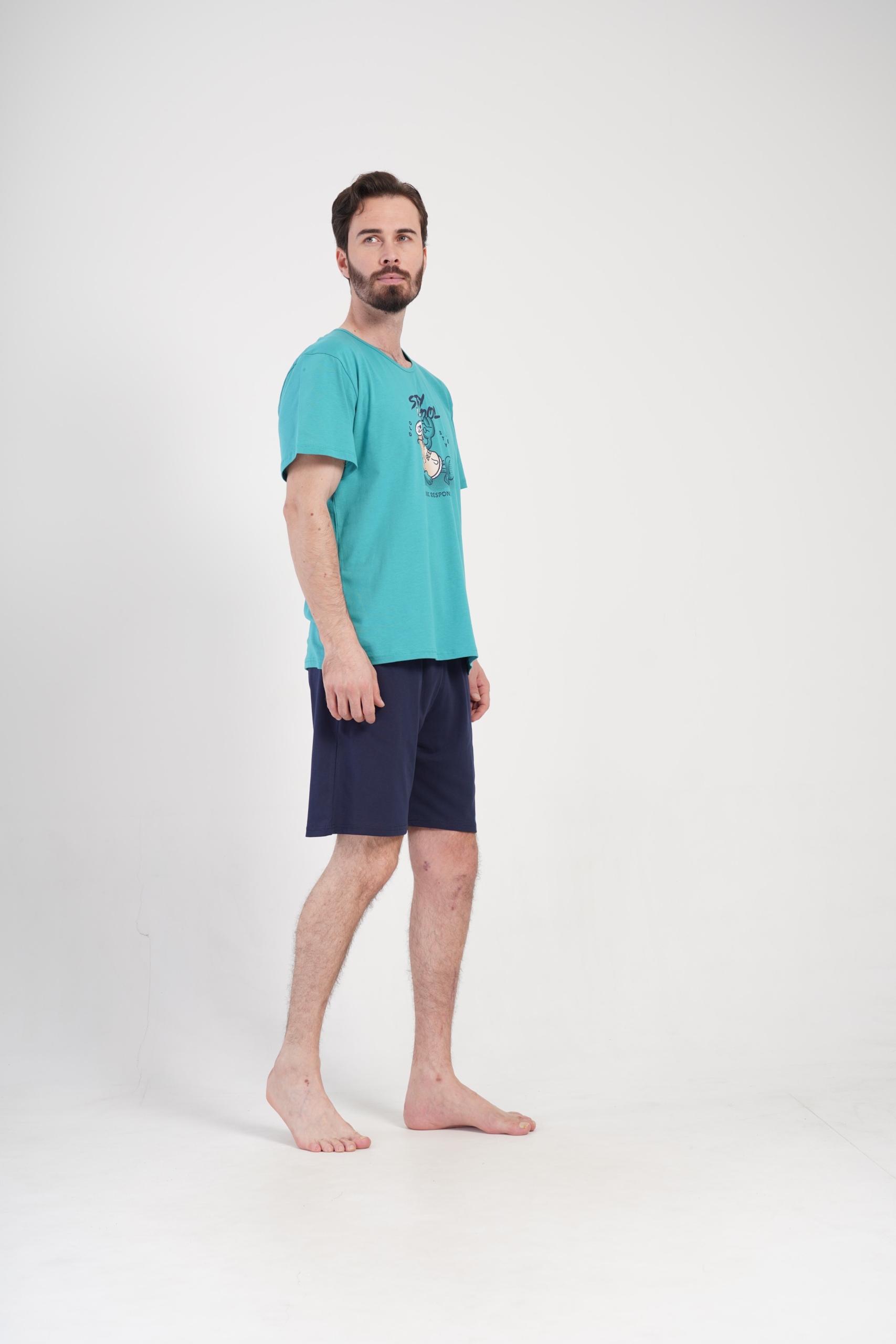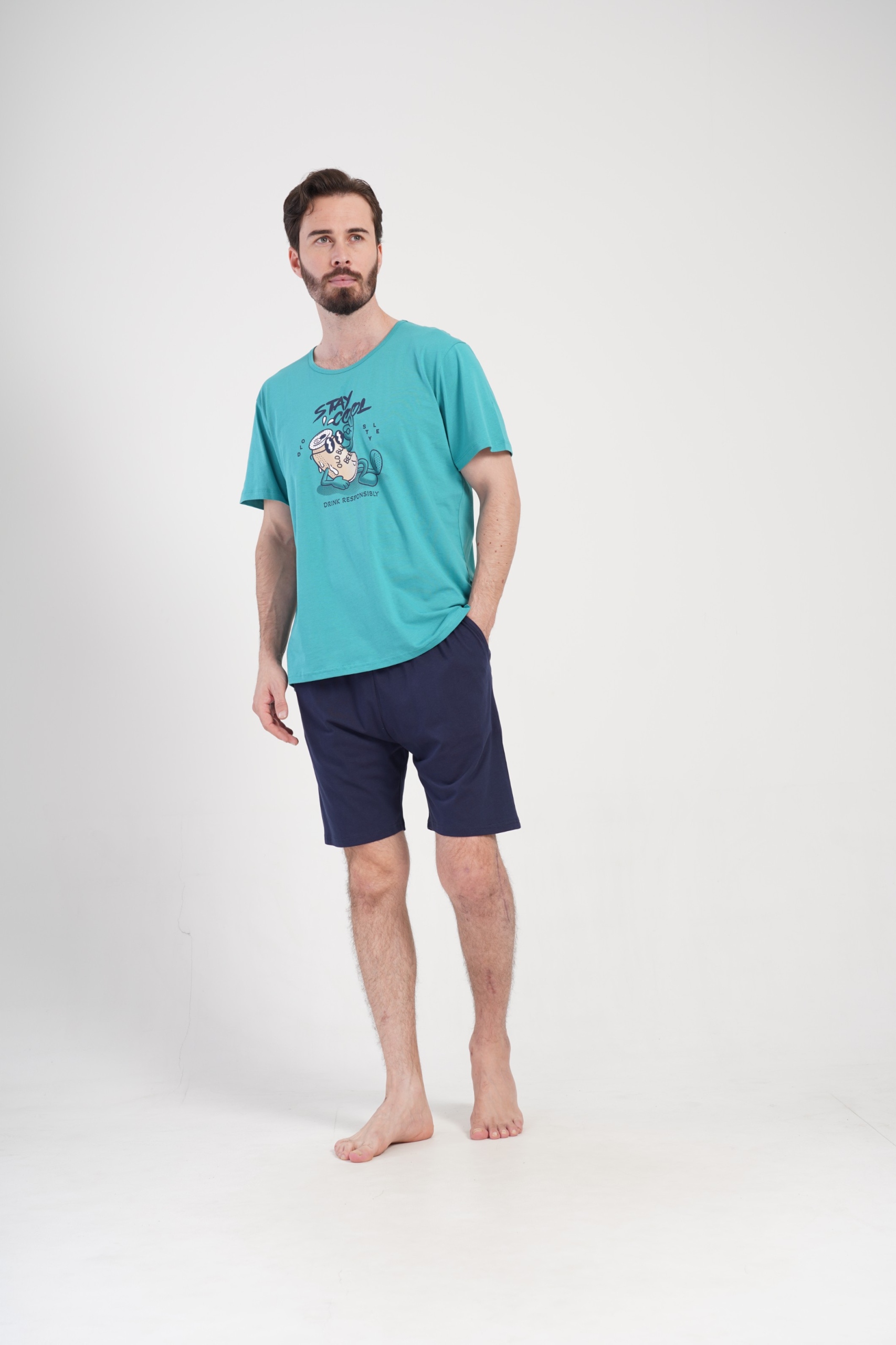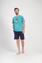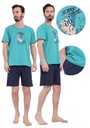 Komfortowa i stylowa piżama męska, która sprawdzi się doskonale zarówno podczas snu, jak i codziennego odpoczynku w domowym zaciszu. Zestaw składa się z koszulki z krótkim rękawem i efektownym nadrukiem oraz jednolitych granatowych spodenek przed kolano.