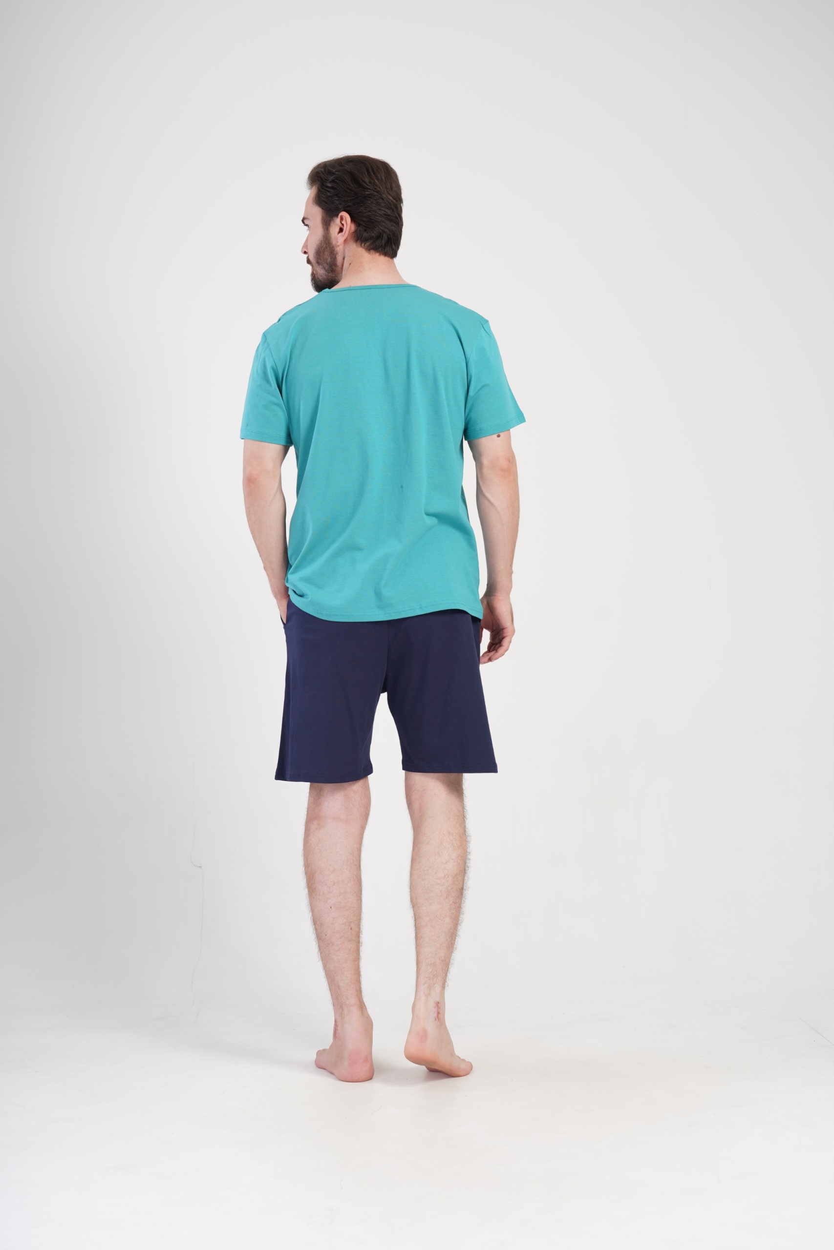 ✅ Kolor: Koszulka – turkusowa z nadrukiem, spodenki – granatowe