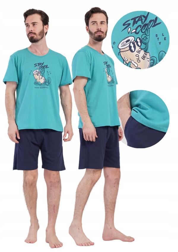 Koszulka posiada zabawny nadruk z napisem "Stay Cool" i grafiką przedstawiającą relaksujący napój – całość utrzymana w swobodnym, wakacyjnym stylu. Spodenki wykonano w prostym kroju, z elastyczną gumką w pasie, zapewniając pełną swobodę ruchów i wygodę noszenia przez cały dzień (lub noc).