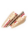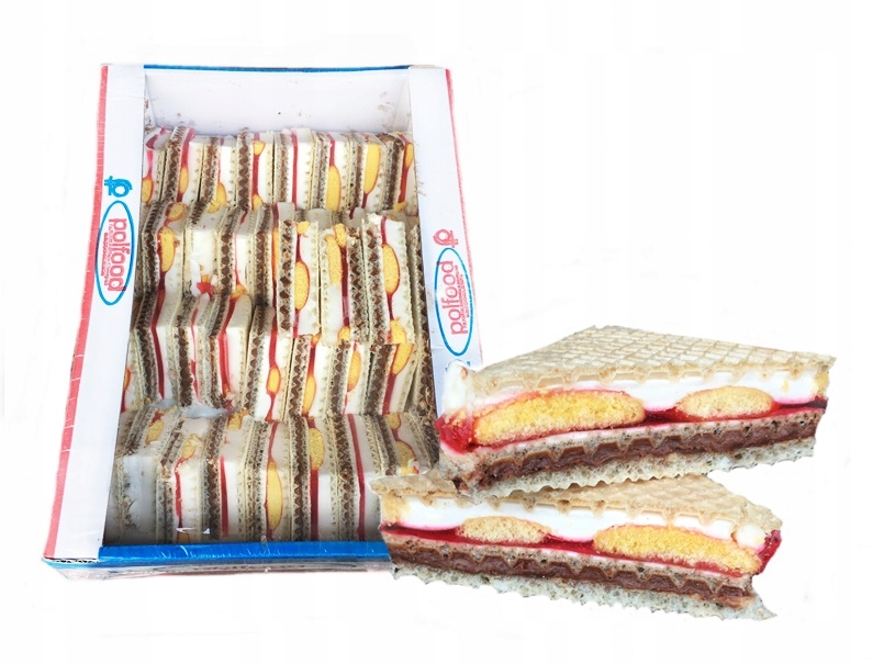 Warstwa waniliowego ptasiego mleczka i galaretki owocowej z biszkoptami w dwóch waflach przełożonych masą o smaku rumowym lub adwokatowym.