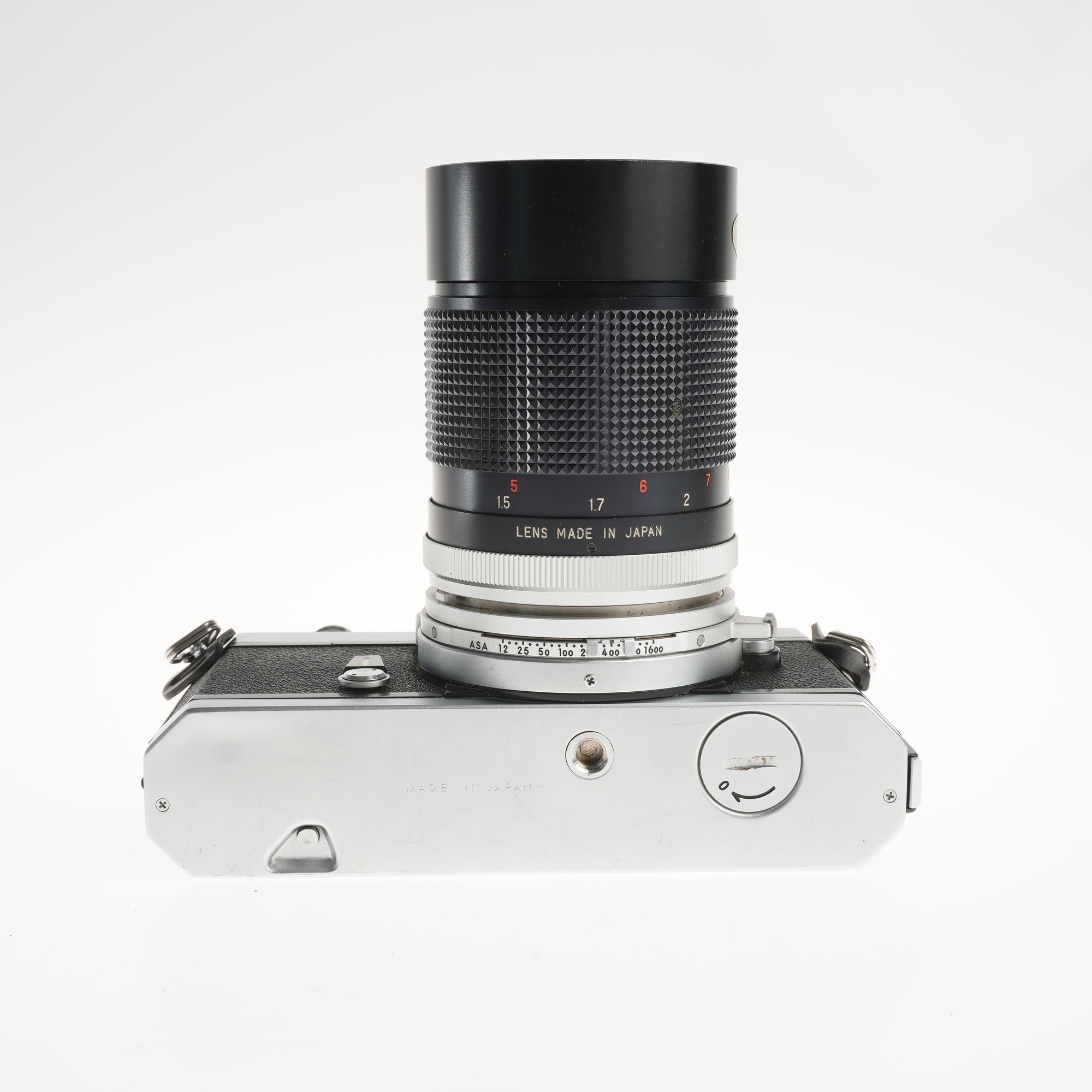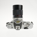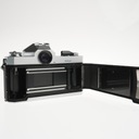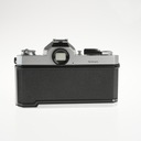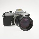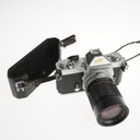 Aparat w dobrym stanie, ryski i jedno płytkie wgniecenie na spodzie aparatu, wnętrze czyste, uszczelnienia do wymiany, lamelki migawki w dobrym stanie, w wizjerze kilka ciemnych pyłków, licznik i nastawy aparatu sprawne, światłomierz działa, migawka sprawna, lustro czyste. Obiektyw w bardzo dobrym stanie, pierścienie nastaw pracują prawidłowo, urwana blaszka przeniesienia przysłony, ale w tym modelu aparatu wartość przysłony przenoszona jest przez wcięcie na pierścieniu przysłony, także komplet działa prawidłowo, przysłona czysta i sprawna, optyka czysta. W komplecie dolna część skórzanego futerału z paskiem, brak baterii.