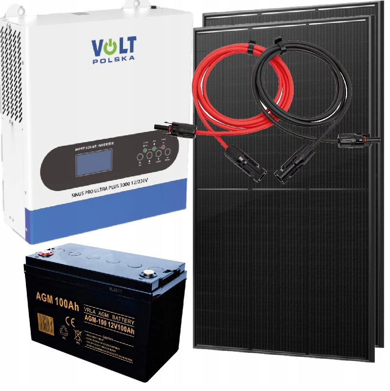 Gotowy zestaw fotowoltaiczny oparty na Przetwornicy solarnej VOLT POLSKA SINUS PRO ULTRA PLUS 3000 z wbudowanym regulatorem ładowania MPPT 100A wraz z PANELAMI SŁONECZNYM 2X440W , akumulatorem 1 X 100Ah,, przewodami oraz końcówkami do podłączenia, tworzą jedyny w swoim rodzaju