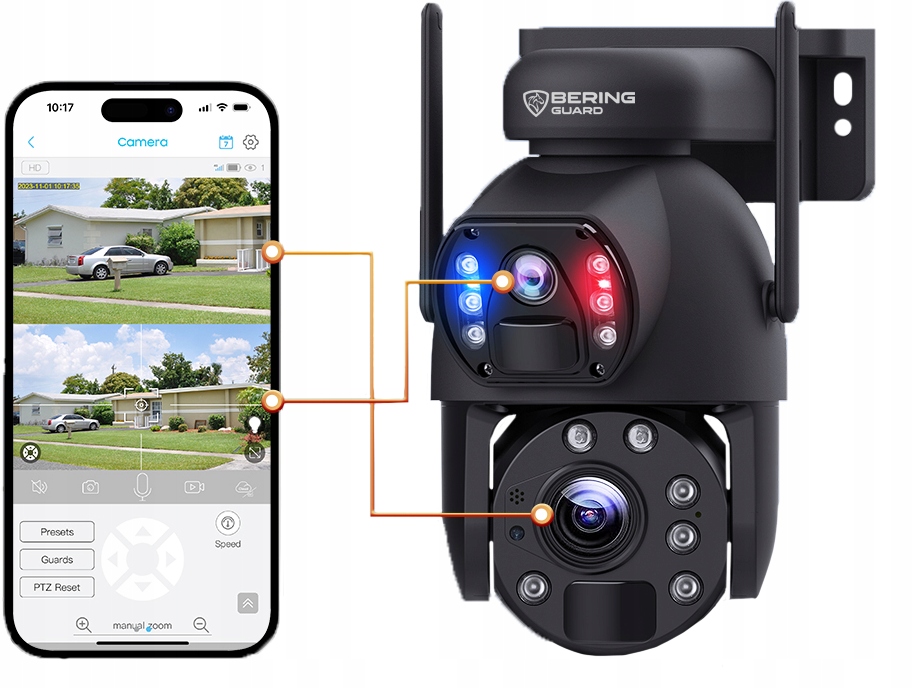 ✅ Dolny obiektyw z obrotową głowicą możemy ustawić w dowolnym kierunku w zakresie 355° lewo prawo i 90° góra dół oraz dodatkowo sterować głowicą kamery bezpośrednio za pomocą telefonu