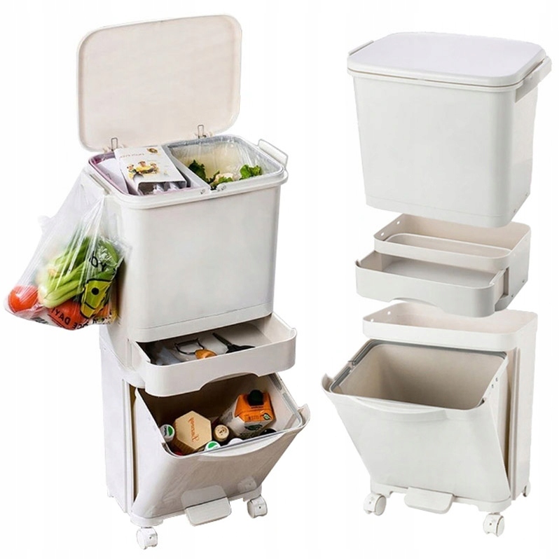 W zestawie specjalny separator dzięki, któremu możemy podzielić górną komorę na dwie części. Każdy ze zbiorników wyposażony jest w uchwyty stabilizujące worki w jednej pozycji. Pokrywa górnego pojemnika posiada system otwierania One-Click - wystarczy delikatnie nacisnąć pokrywę w zaznaczonym miejscu i gotowe. Między górnym a dolnym pojemnikiem jest szuflada. Może ona służyć jako miejsce do przechowywania worków na śmieci i przydatnych akcesoriów. Dolny pojemnik jest bardzo pojemny, posiada stopkę do otwierania pojemnika, a uchwyty mocujące worek służą także jako rączki do przenoszenia. Pojemnik nie jest integralną częścią zestawu, można go szybko wyjmować i wkładać ponownie. U podstawy kosz posiada kółka obrotowe z możliwością blokady. Dzięki nim kosz niezwykle mobilny, łatwy w przesuwaniu i użytkowaniu.