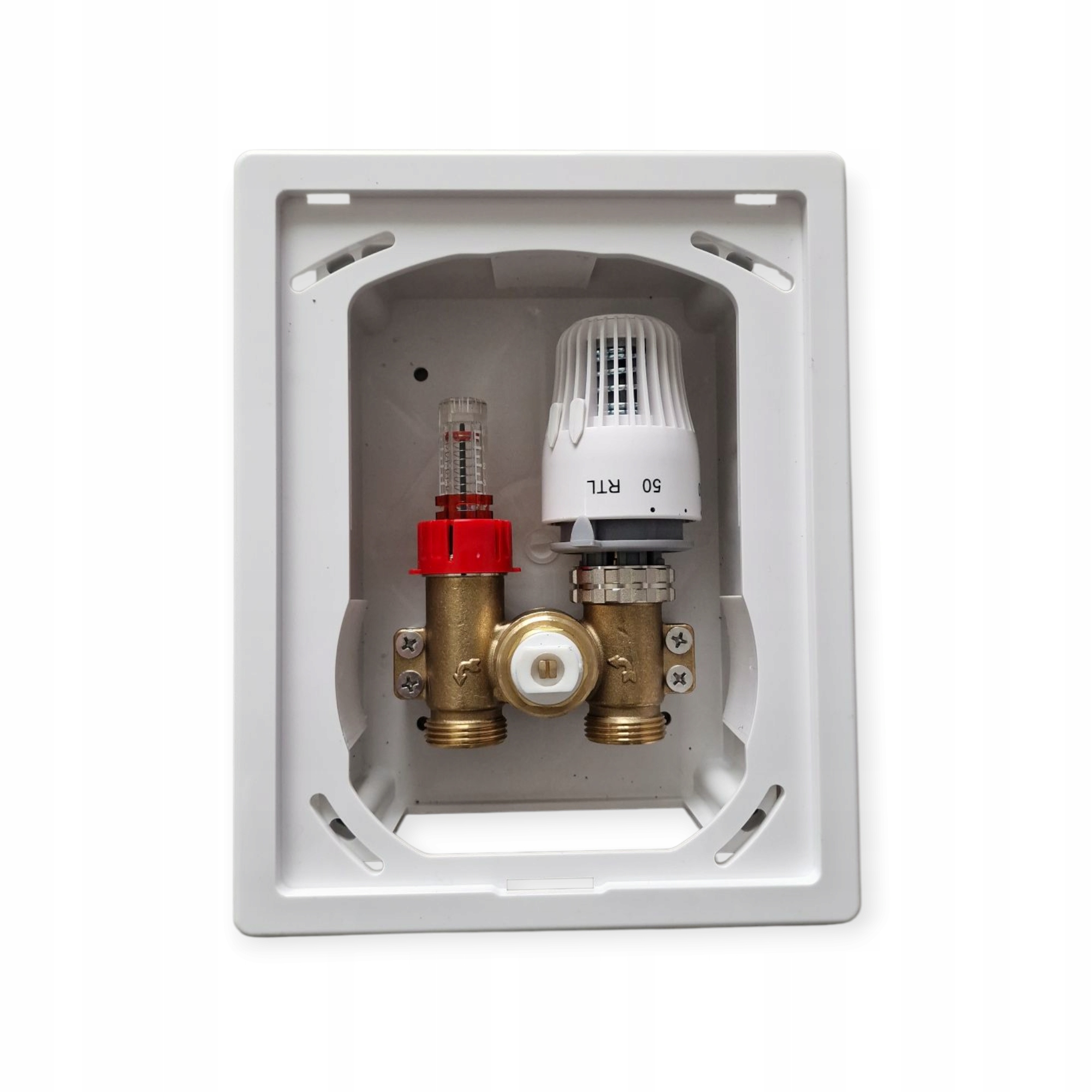 Zestaw składa się z głowicy RTL, zaworu termostatycznego ze specjalistyczną wkładką o zwiększonym przepływie, odpowietrznikiem z kluczem, zestawem śrub i łapami mocującymi.Zestaw montowany jest na powrocie pętli ogrzewania podłogowego. Zakres regulacji głowicy zapewnia właściwą temperaturę czynnika grzewczego podczas przepływu przez pętlę.