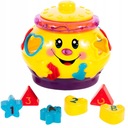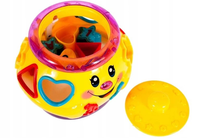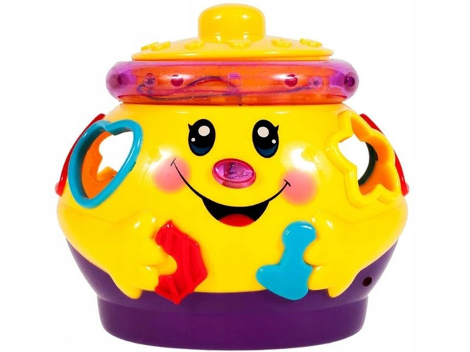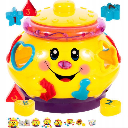 W każdym garnuszku znajduje się 6 klocków które, pomagają poznawać kształty przez dopasowywanie ich do odpowiednich otworów w garnuszku. Klocki można wyjąć przez otwór pod pokrywką.