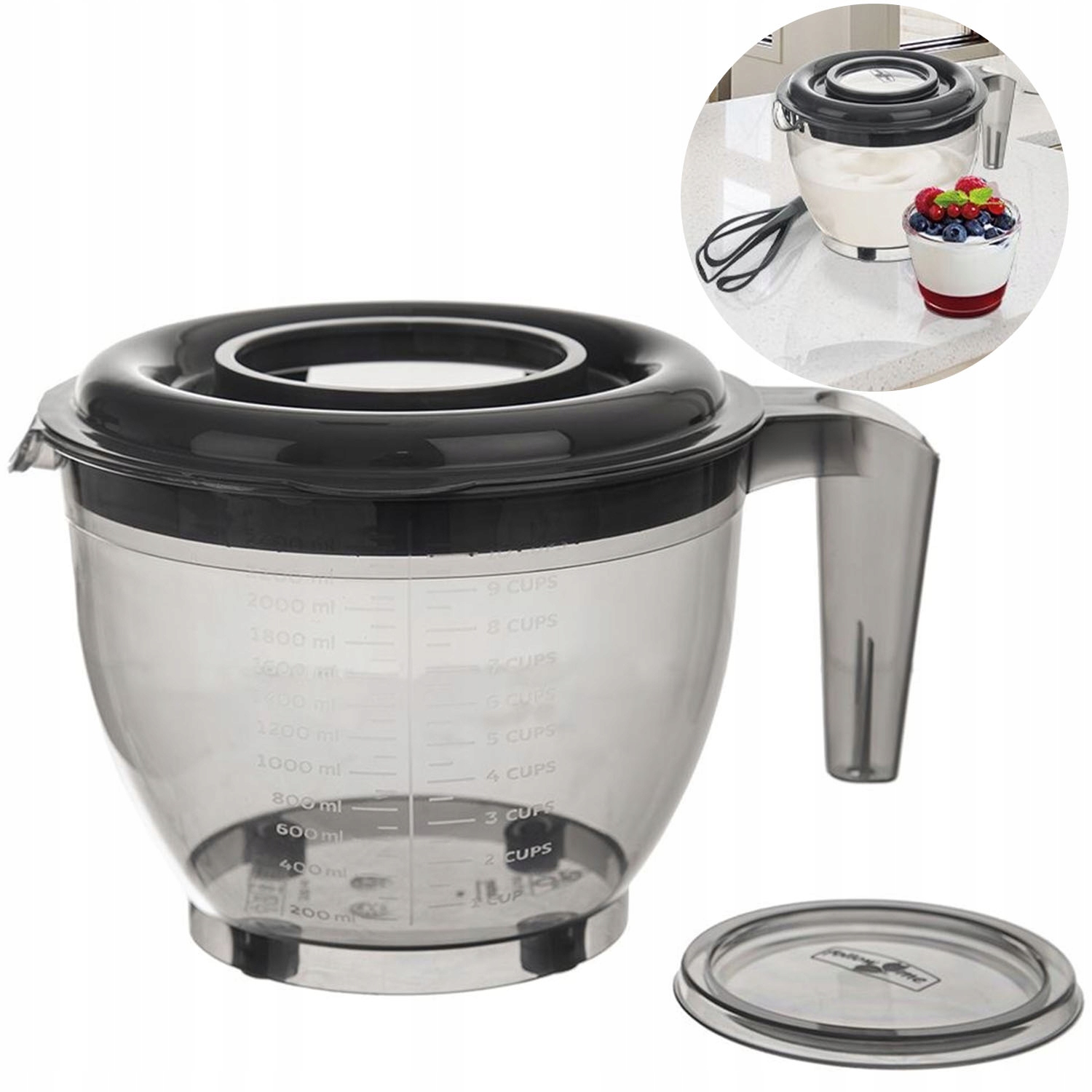 Miska o pojemności 2,5 litra z dwu-częściową pokrywką, wygodnym uchwytem oraz dziubkiem. Miska ma wysokość 16 cm, szerokość 19 cm a całkowita długość miski wraz z uchwytem wynosi 24,5 cm. Miska wykonana jest z tworzywa w kolorze szarym. Posiada również miarkę od 200 do 2400 ml oraz podziałkę na kubki od 1 do 10. Niezwykle przydatna podczas miksowania, mieszania oraz ubijania. Dzięki pokrywce składającej się z dwóch części miksowane rzeczy nie rozpryskują się. Podczas miksowania ściągamy tylko mniejszą część pokrywy. Po wyciągnięciu środkowej części pokrywki możemy umieścić mikser i miksować bez obaw, że zawartość miski rozpryska się po kuchni. Miska jest stabilna dzięki czterem antypoślizgowym nóżkom, wylewka w postaci precyzyjnego dziubka pozwoli nam na odpowiednie nalanie zawartości miski. Dzięki dużej odporności na temperatury możemy używać miski również do podgrzewania w mikrofalówce, ale pamiętając o zdjęciu pokrywki. Miskę można myć w zmywarce do naczyń. Przydatna w każdym domu. Oryginalny produkt czeskiej marki Orion. Wyprodukowano zgodnie z europejskimi standardami.