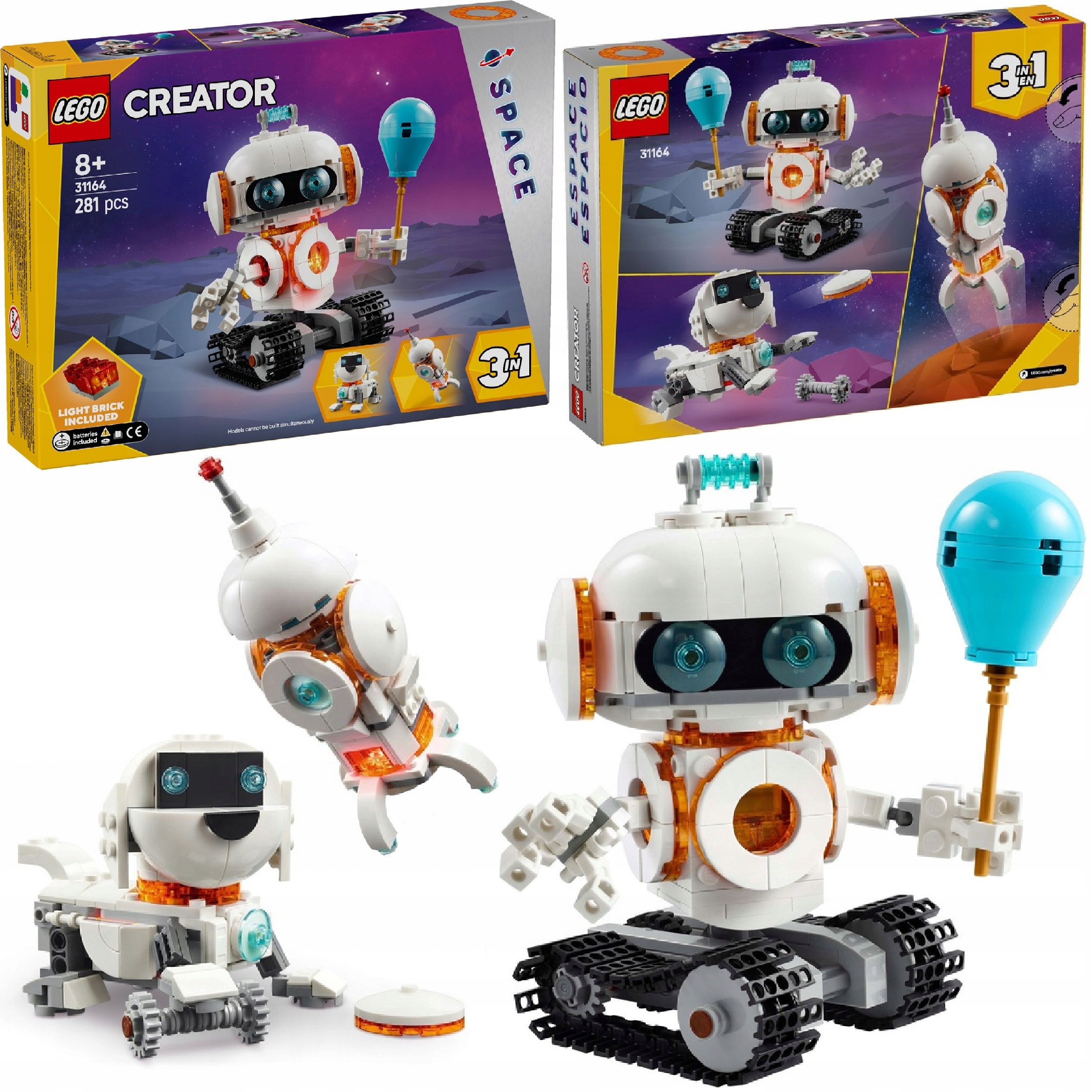 Fani LEGO mogą zbudować i przebudować trzy różne kosmiczne figurki z tych samych klocków: robota na ruchomych gąsienicach, psa z kością i latającym dyskiem lub rakietę kosmiczną.