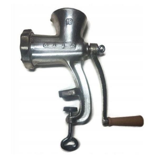 Klasyczna maszynka do mielenia mięsa wykonana z odlewu żeliwnego, rączka z drewnianym uchwytem.