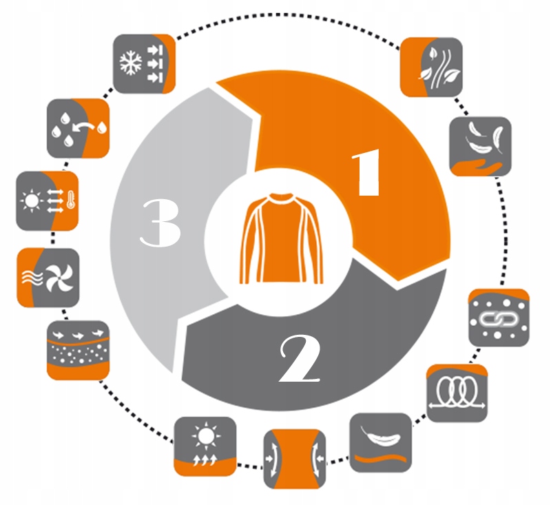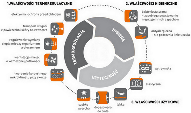 Rozciągliwa dzianina z systemem stref wentylacyjnych szybko odprowadza wilgoć i zapewnia dostęp świeżego powietrza. Dzięki temu skóra pozostaje sucha, co minimalizuje ryzyko przeziębienia. Wewnętrzna warstwa z delikatną przędzą (z polipropylenem) jest przyjemna w dotyku i nie powoduje podrażnień – nawet przy spoconej czy wrażliwej skórze.