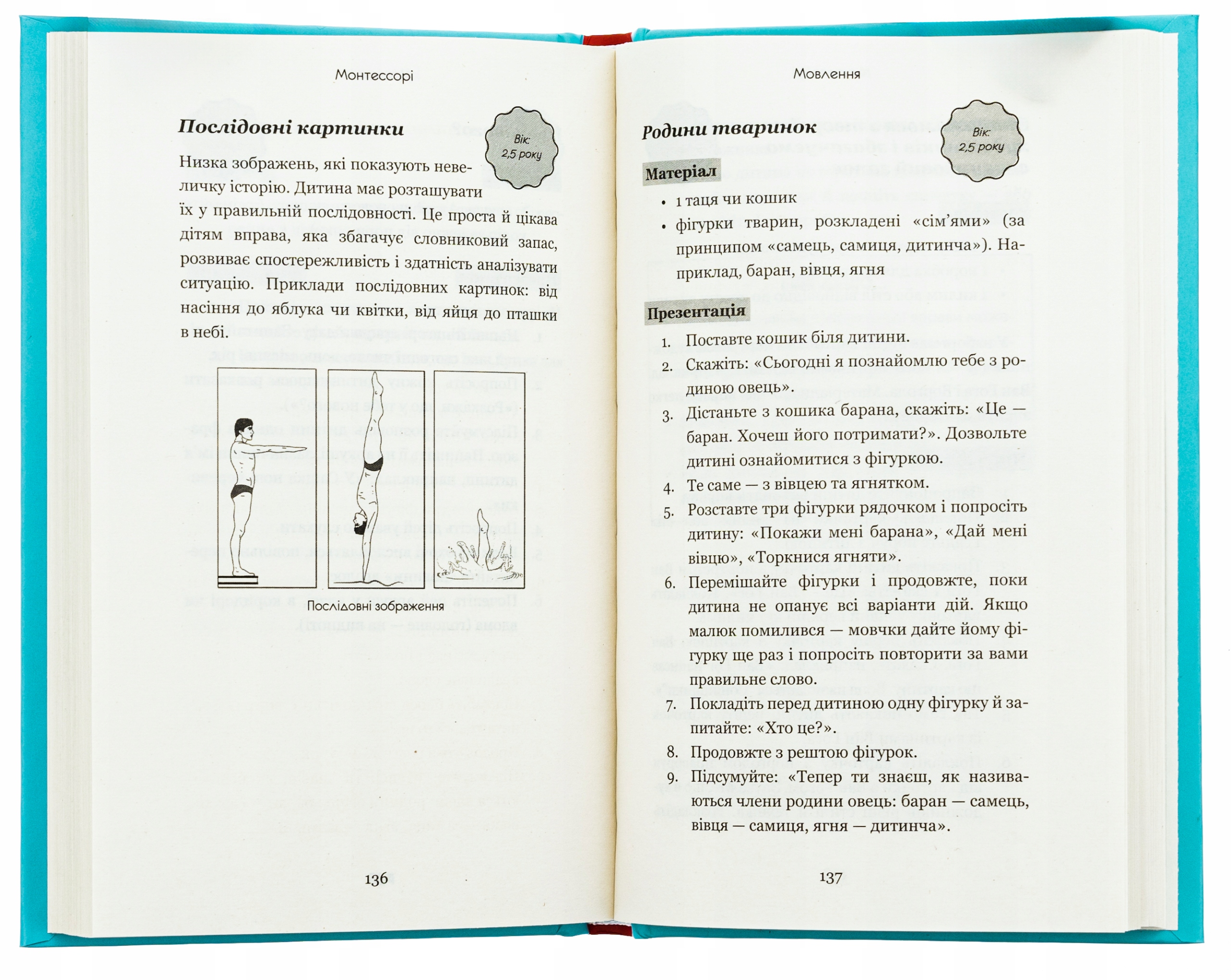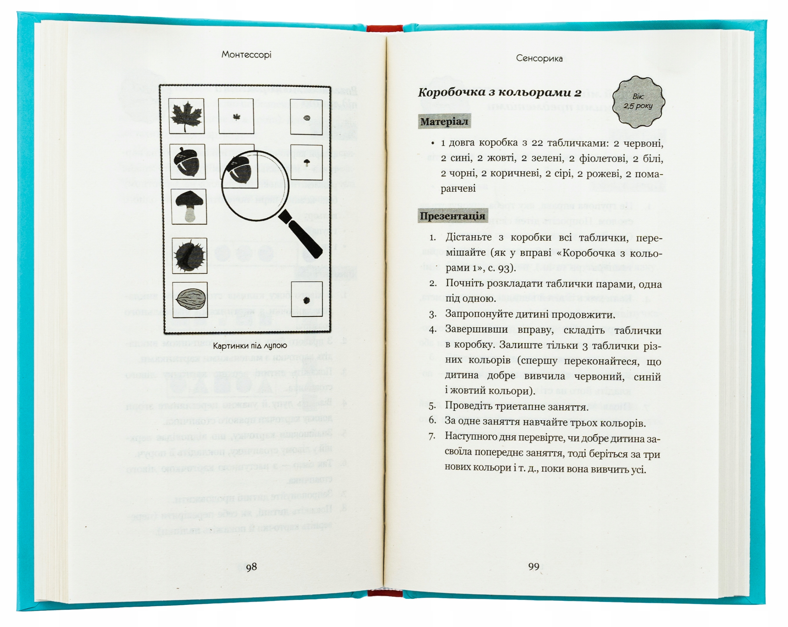 Автори книги пропонують методичні пояснення до занять і безпосередньо вправи, кожна з яких містить детальний опис матеріалів і засобів та спосіб виконання. Під час занять використовуються звичні й наявні в побуті предмети: посуд, природні матеріали, підручні засоби тощо. Вже в перші місяці життя ваша дитина зможе опановувати важливі навички, які закладуть підґрунтя для подальшого гармонійного розвитку.