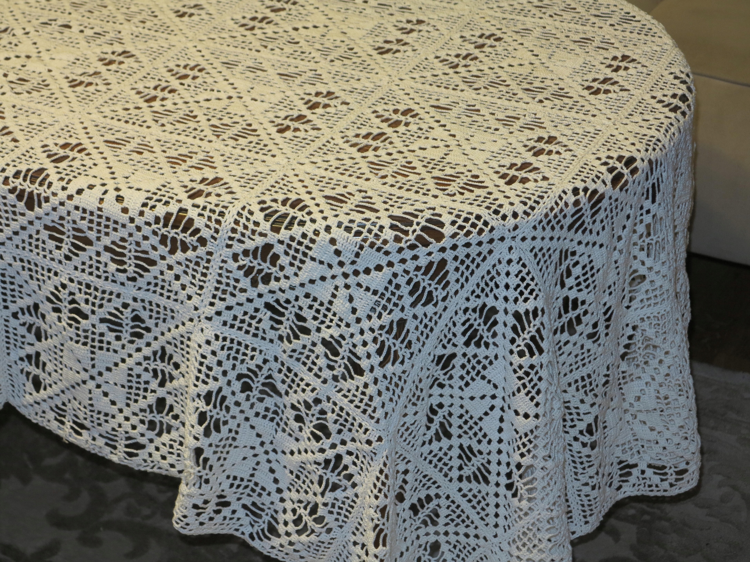 PIĘKNY BIELUSIEŃKI OBRUS, W CAŁOŚCI RĘCZNIE WYKONANY NA SZYDEŁKU SOLIDNYMI NIĆMI BAWEŁNIANYMI