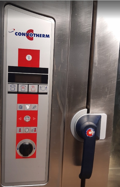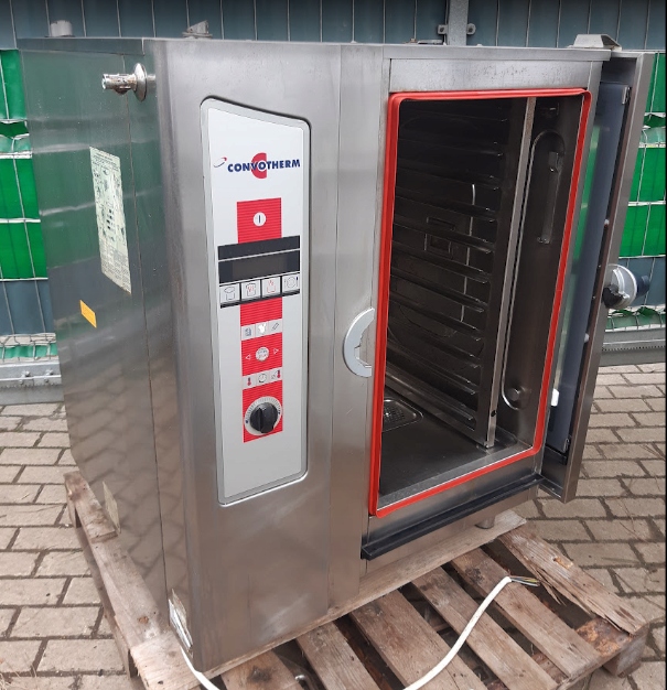 Piec konwekcyjno-parowy Niemieckiej produkcji Convotherm OES 10.10 . Ma płynną regulację czasu, regulacje temperatury, oświetlenie komory, wymuszony obieg powietrza, obroty wentylatora prawo-lewo, program pieczenia, regeneracji, gotowania i wiele innych. Ma możliwość zaprogramowania własnych programów, a następnie automatyczne wybieranie ich w menu. Zasilanie na 380V. Ma przyłącza wody i kanalizacji. Możliwość wsunięcia drzwi na ściną boczną pieca, dla wygodnego wkładania blach do środka. Wymiar zewnętrzny 94 x 83cm głębokość x 113cm wysokość. Piec w dobrym stanie.