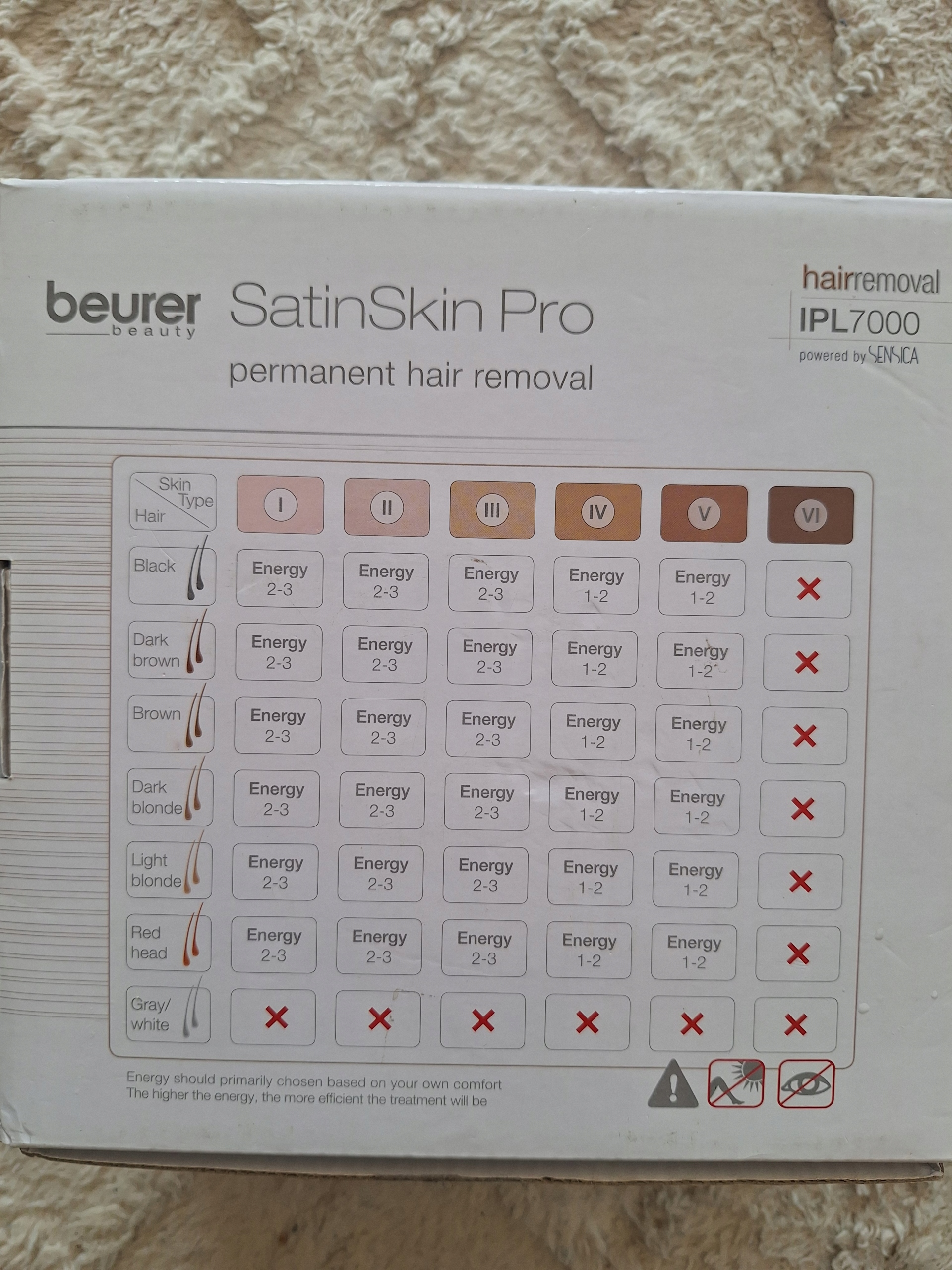 Mam do sprzedania depilator Beurer SatinSkin Pro IPL7000. Urządzenie wykorzystuje najnowocześniejszą technologię impulsów świetlnych, Intensed Pulsed Light (IPL) powoduje dezaktywację mieszka włosowego, co zapobiega porostowi włosa. Urządzenie jest poręczne i kompaktowe. Zabieg jest prosty w przeprowadzeniu i maksymalnie bezpieczny, dzięki czujnikowi kontaktu ze skórą oraz czujnikowi typu skóry. Czujnik kontaktu ze skórą zapobiega przypadkowemu wysyłaniu impulsów w powietrze. Urządzenie posiada zintegrowaną funkcję ochrony przed promieniowaniem UV. Czujnik wykrywania typu skóry pozwala kontrolować czy na danej skórze wykonanie zabiegu będzie bezpieczne (urządzenie nie może być używane do naturalnie ciemnych typów skóry oraz do bardzo jasnych lub siwych włosów). Urządzenie wytwarza jeden impuls na sekundę, może pracować na trzech poziomach mocy. Jakie efekty można osiągnąć? Trzy lub cztery zabiegi pozwalają zredukować owłosienie nawet o 50%! Beurer SatinSkin Pro IPL 7000 przeznaczony jest do trwałego usuwania włosków w warunkach domowych. Można stosować do twarzy, nóg, rąk, pach, okolic bikini, brzucha i klatki piersiowej u mężczyzn. Produkt przechowywać w miejscu niedostępnym dla dzieci. Technologia została przebadana klinicznie. Istnieje możliwość pobrania aplikacji Beurer MyIPL.