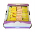 Chrupiące wafelki przekładane masą białkową z żelem o smaku owocowym i wieloowocową galaretką.