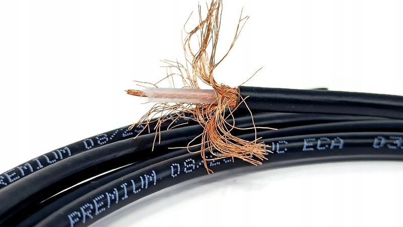 Przewód 50 Ohm RG-58 PREMIUM produkcji firmy SATEC o średnicy zewnętrznej 5 mm, w którym żyłę środkową wykonano jako linkę miedzianą 0,96 mm a ekran jako oplot alu miedziowany z pokryciem 90% ! Dielektryk wykonano z litego polietylenu. W odróżnieniu od tanich, kiepskich produktów, cechują go dobre parametry elektryczne - niskie tłumienie oraz wysoka skuteczność ekranowania.