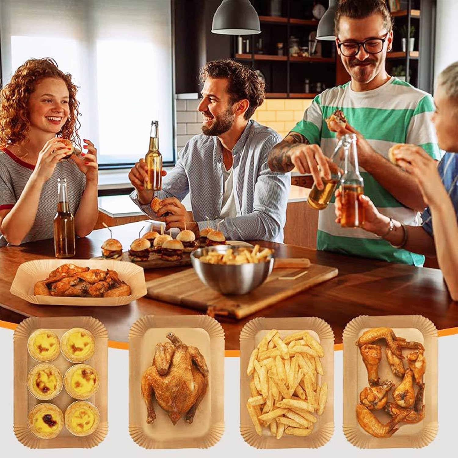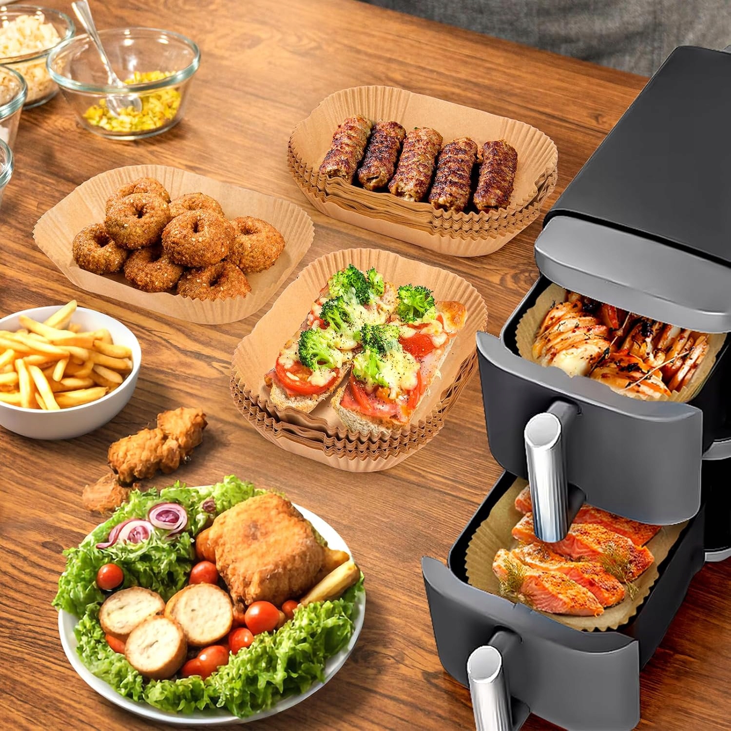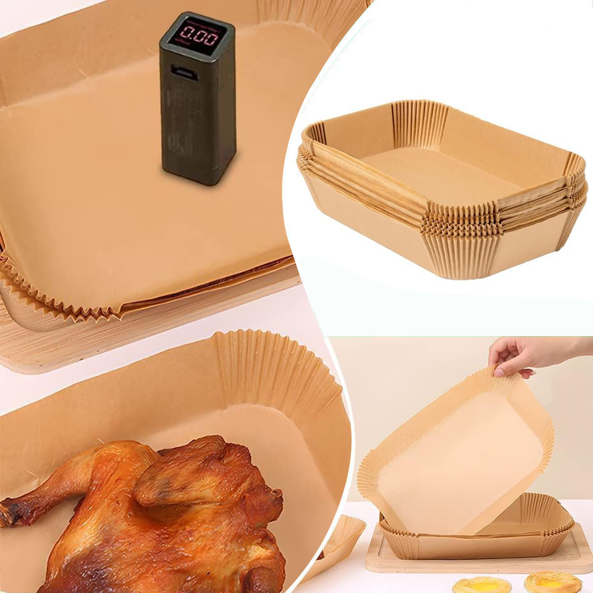 Nasze jednorazowe wkładki papierowe nie zakłócają wewnętrznej cyrkulacji powietrza w frytkownicy. Ciepło generowane przez cyrkulację powietrza nie jest negatywnie wpływane, a tłuszcz wypływa z wkładu papierowego podczas pieczenia, co przekłada się na zdrowsze gotowanie.