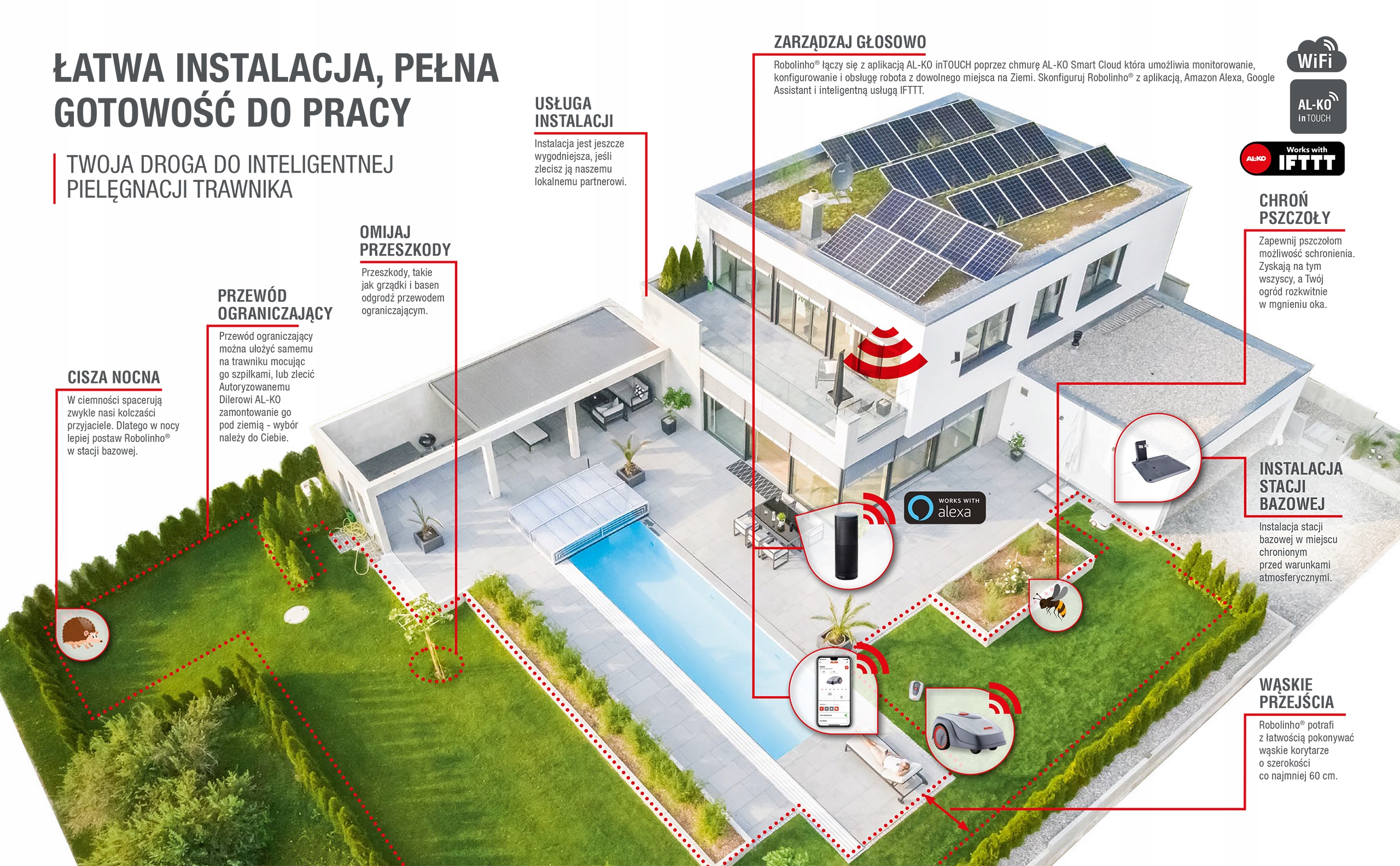 AL-KO 550 W zbudowano z niesamowicie wytrzymałych podzespołów, aby spełniał swoją funkcję jak najdłużej. Producent dołożył wszelkich starań aby instalacji urządzenia mógł dokonać każdy. Dotyczy to również samej konfiguracji robota.