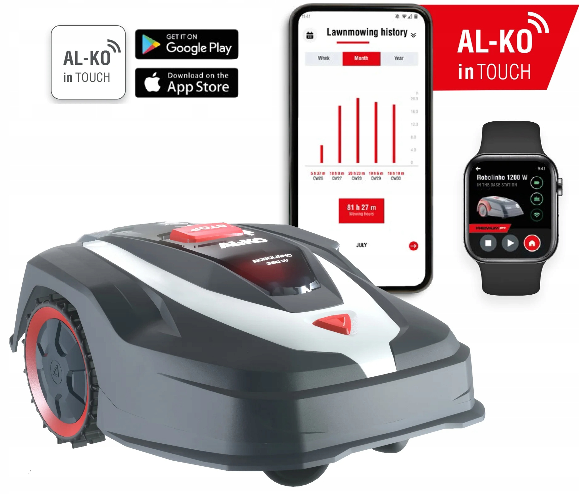 Dzięki AL-KO inTOUCH możesz obsługiwać urządzenie Robolinho z dowolnego miejsca na świecie – z domowej sofy lub z hotelu podczas urlopu. Robot wysyła do aplikacji powiadomienia o statusie swojej pracy oraz przyjmuje polecenia głosowe od użytkownika.