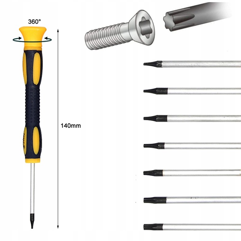 ✔️ 9 wkrętaków Torx wyposażonych w długi obrotowy uchwyt, ułatwiający operowanie.