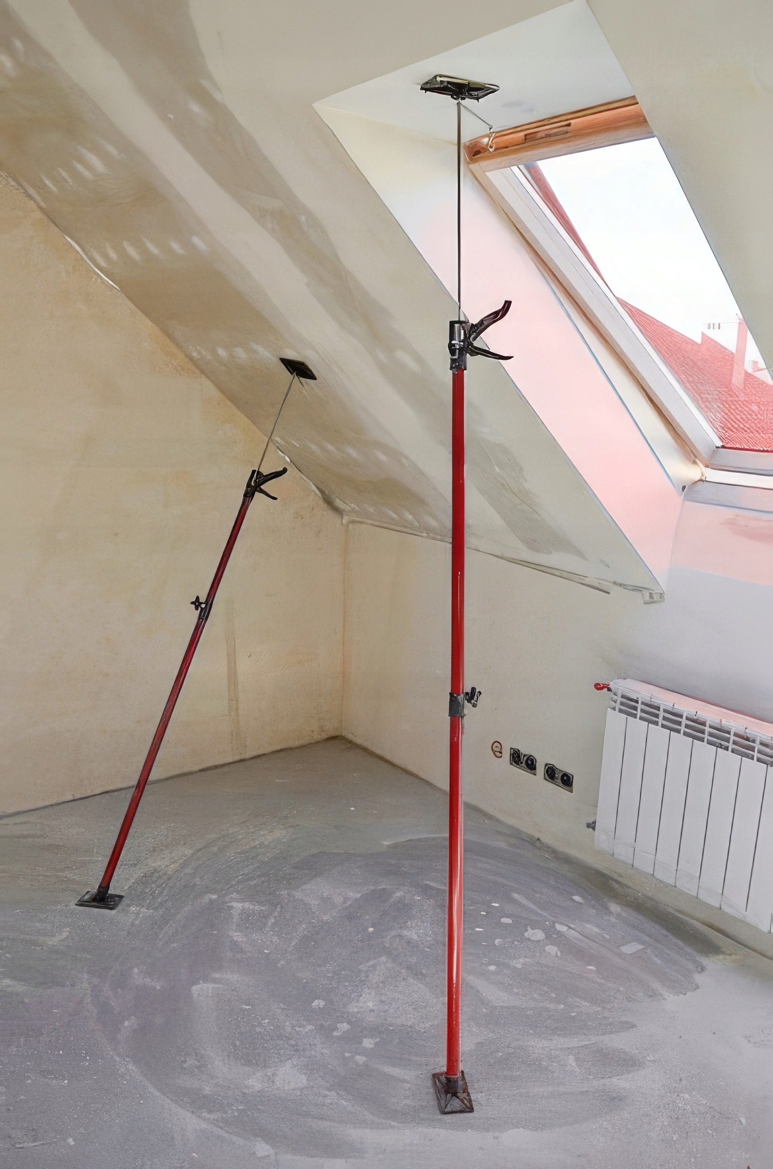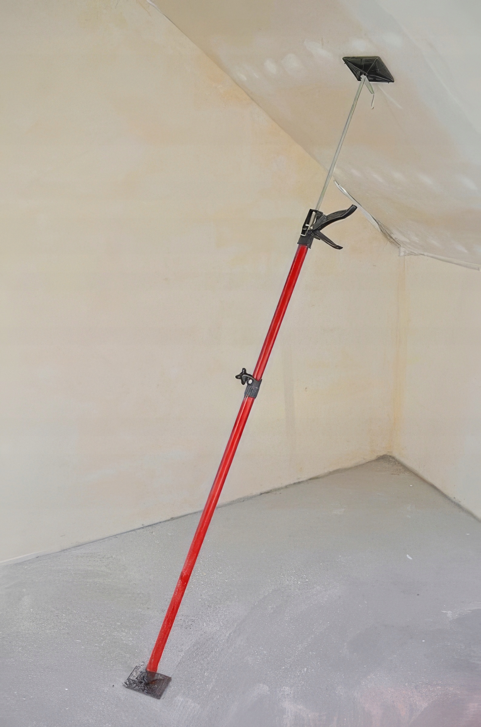 Телескопические опоры они предназначены для временного крепления строительных и конструкционных элементов. Чаще всего используется для крепления гипсокартона или других панелей во время их установки и постоянного прикручивания, например. на потолках . Регулировка длины осуществляется в два этапа путем предварительного выдвижения из корпуса и блокировка пружинными штоками, а также точное выдвижение и подгонка опор, выполняемых за с помощью рычажной кнопки. Максимальная безопасная нагрузка - 30 кг. Рабочий диапазон 115-290 см.