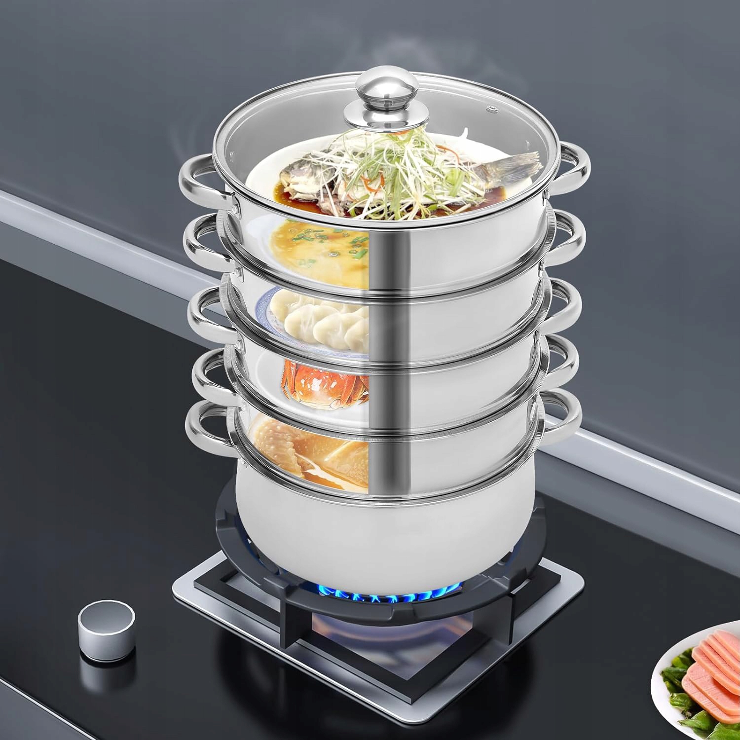 1 x 5-poziomowy parowar ze stali nierdzewnej.