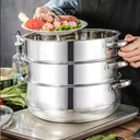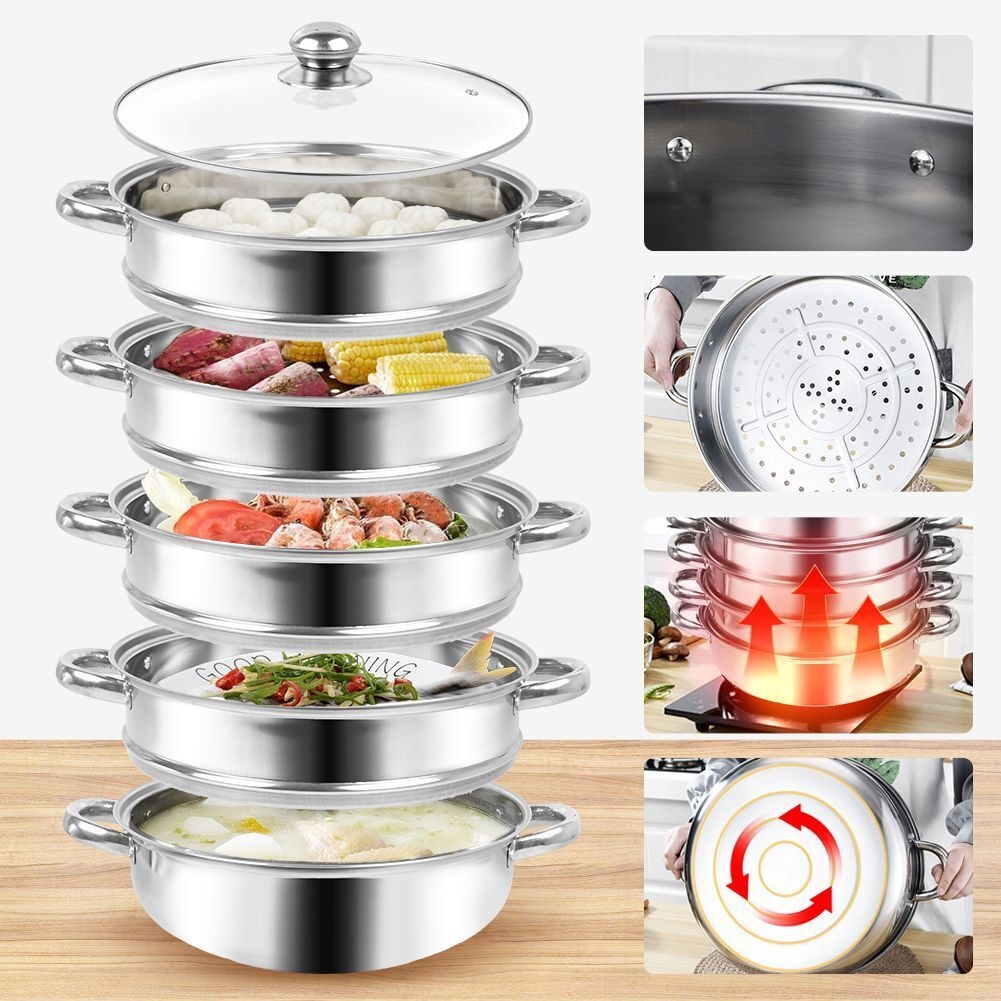Gęste otwory w kratce parowej umożliwiają szybszą cyrkulację pary i szybszą prędkość gotowania. Dolny garnek ma dużą pojemność i może nie tylko parować potrawy, ale również gotować zupę, wodę i makaron.