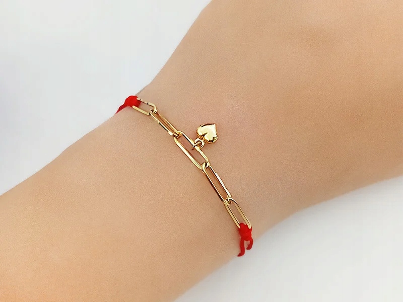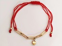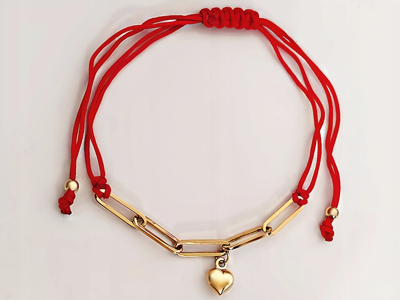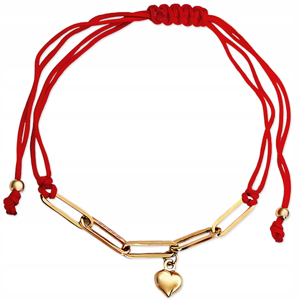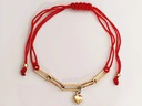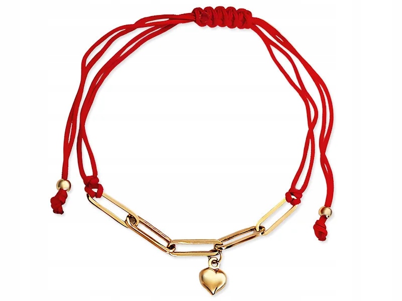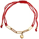 Złota bransoletka na czerwonym sznureczku z dużymi ogniwami i wiszącym serduszkiem.