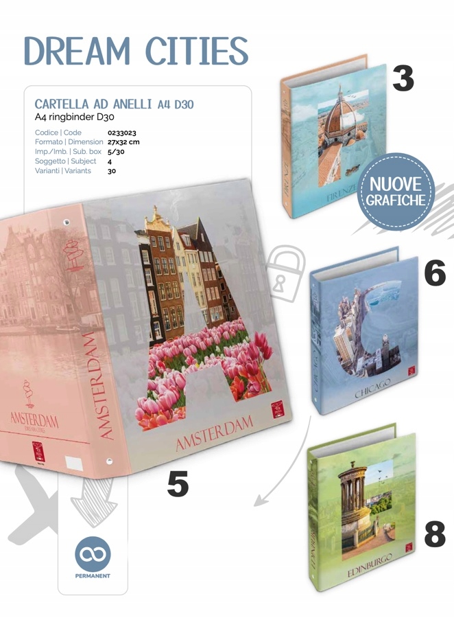 Segregator A4 Pigna Dream Cities, 4 zaczepy. Do wyboru różne wzory okładek.