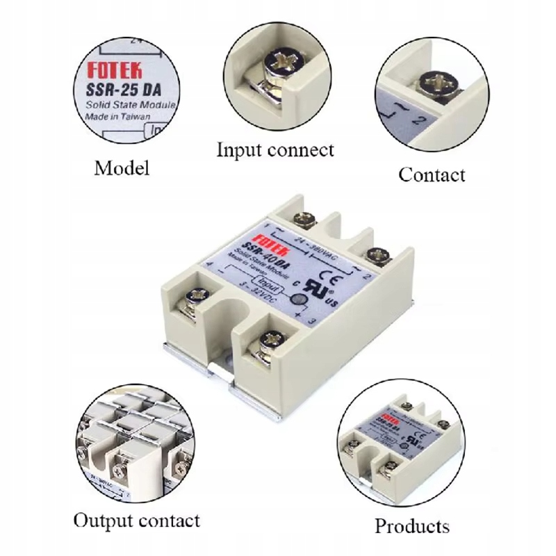 Moduł przekaźnika półprzewodnikowego bezstykowego o maksymalnym natężeniu prądu do 40A i napięciu pracy od 24V do 380V AC. Dzięki temu, że przekaźnik nie zawiera elementów mechanicznych, nie występuje iskrzenie i jest odporny na wilgoć dzięki temu jego żywotność jest bardzo długa. Stosuje się go do przełączania z dużą częstotliwością prądu do odbiorników o zwiększonej mocy.