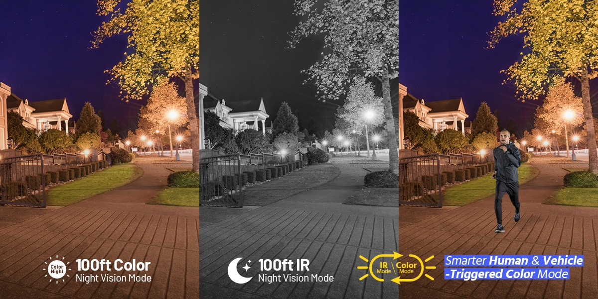 Możesz wybrać tryb oświetlenia, który najlepiej odpowiada Twoim wymaganiom: kolor 24/7, IR lub inteligentne podwójne światło. W trybie inteligentnego podwójnego światła kamera utrzymuje oświetlenie podczerwone, dopóki zdarzenie nie uruchomi obrazowania kolorów w celu uchwycenia krytycznych szczegółów. Białe światło i światło wypełniające podczerwień to odległość do 30 m do jasnego obrazowania nocnego.