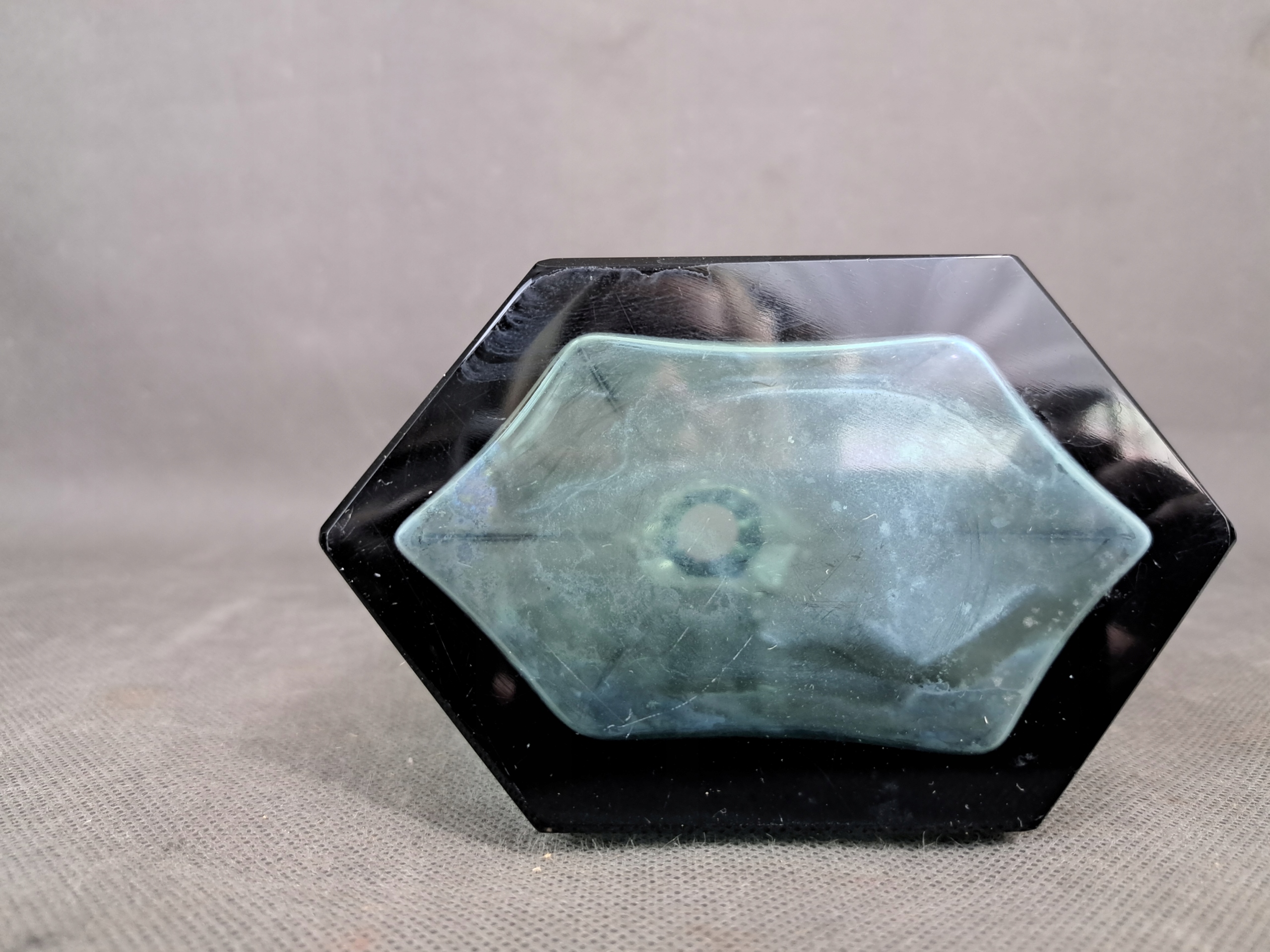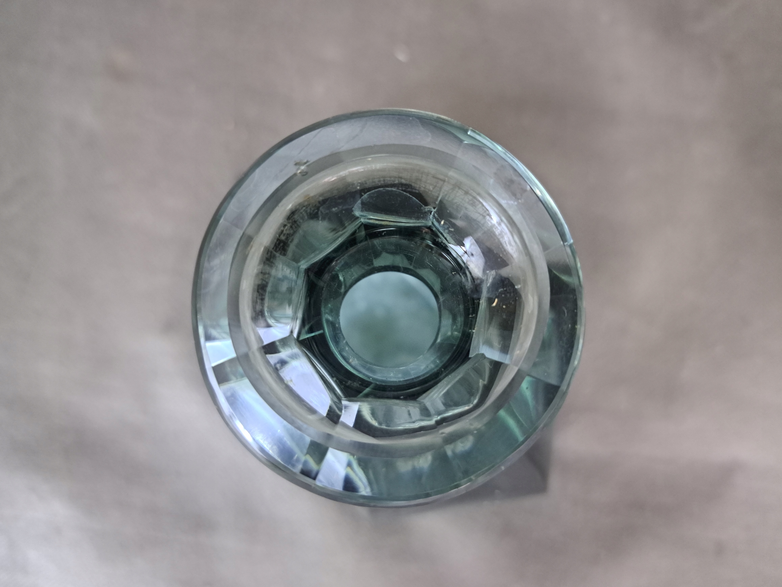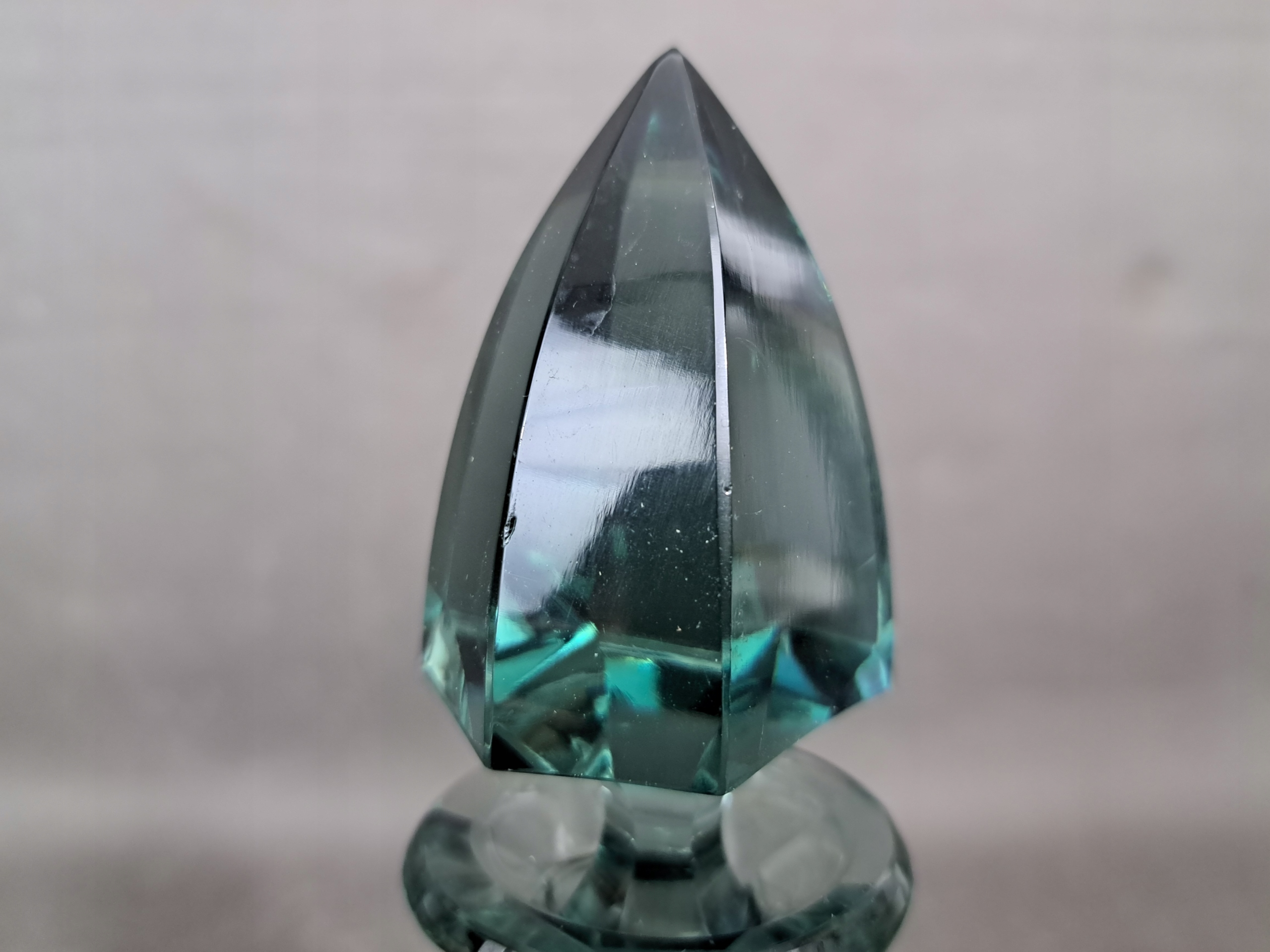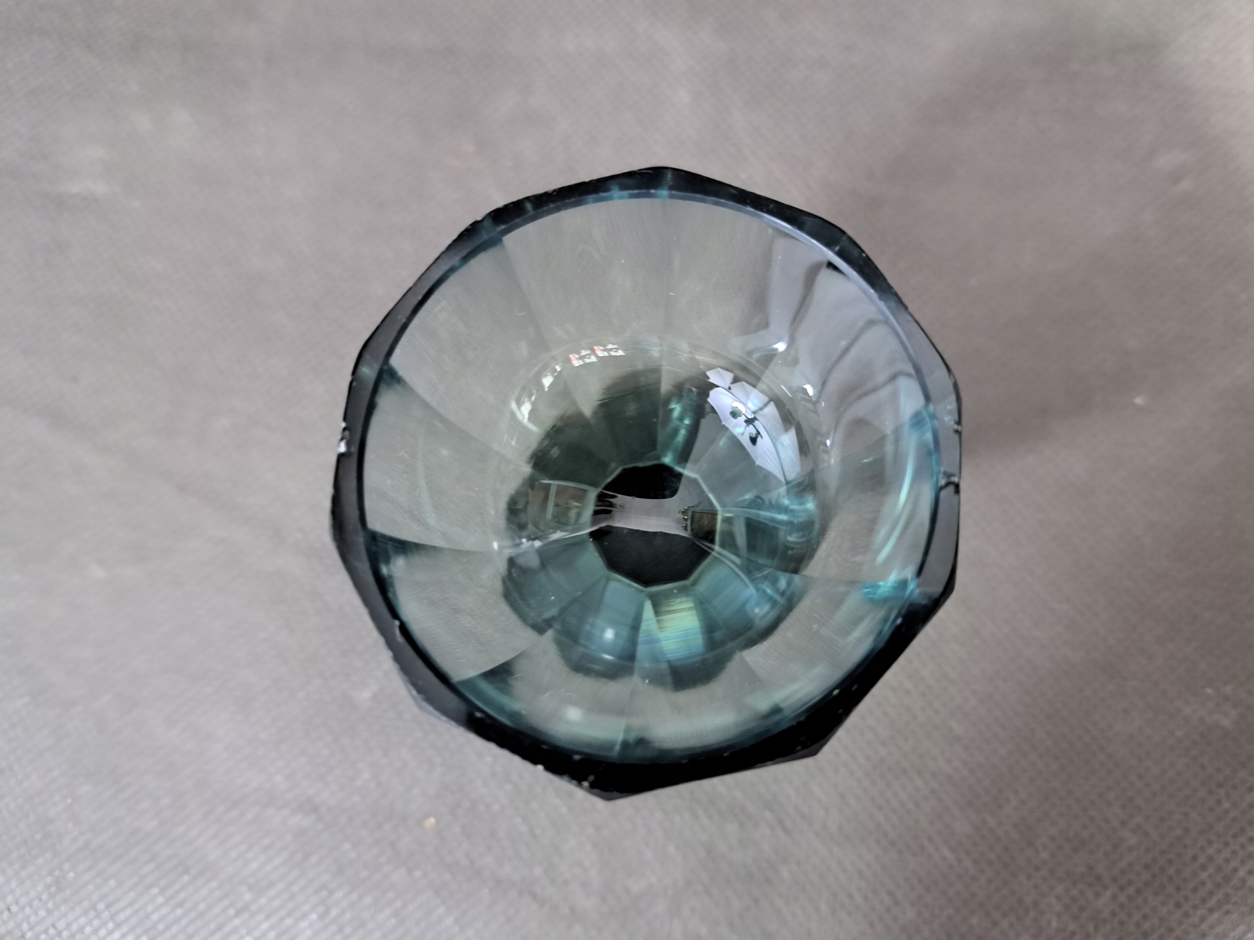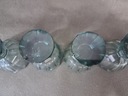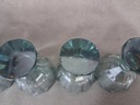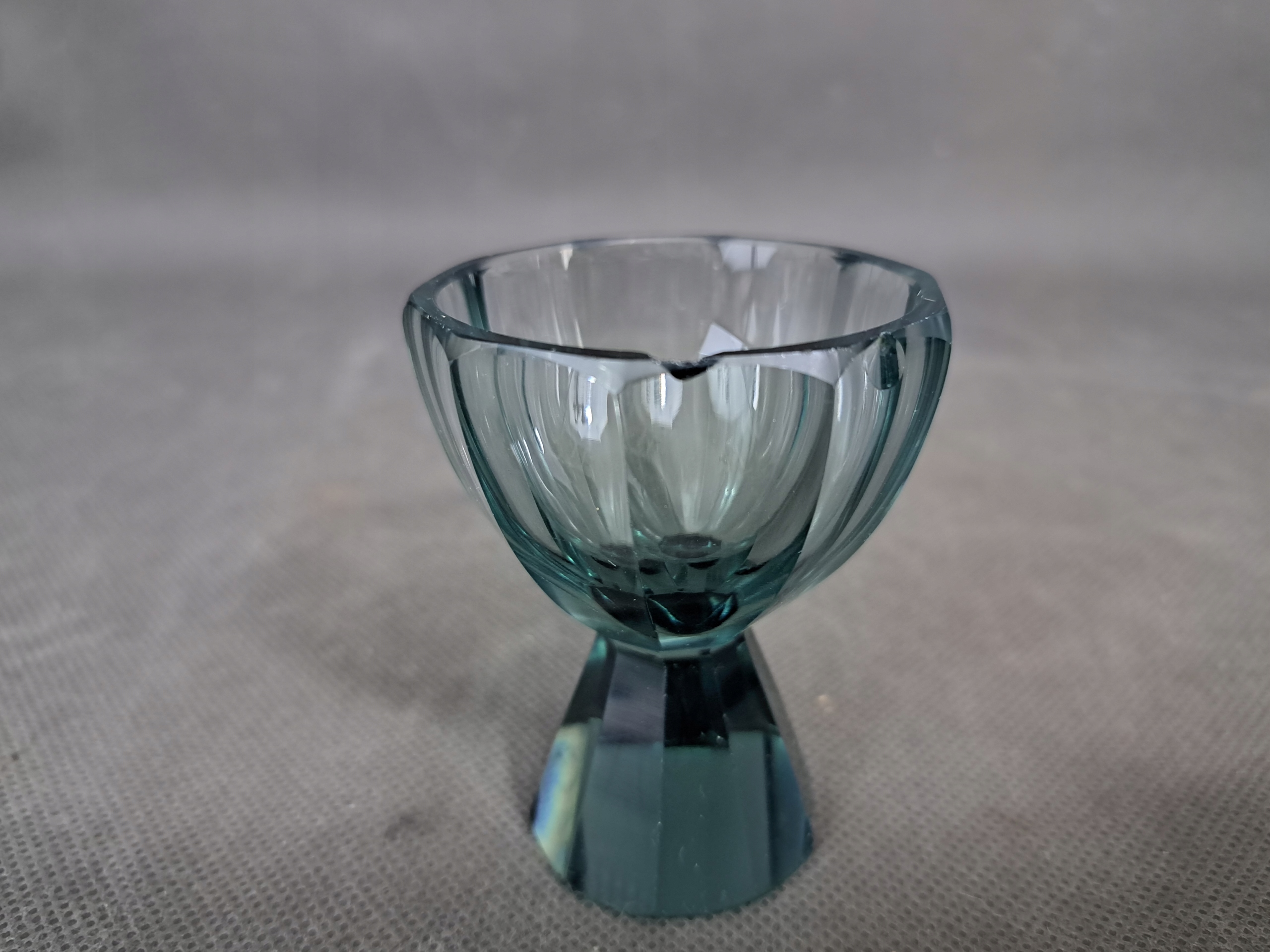 Występują drobne odpryski widoczne na zdjęciach, ubytek na krawędzi kieliszka, biały osad wewnątrz karafki.
