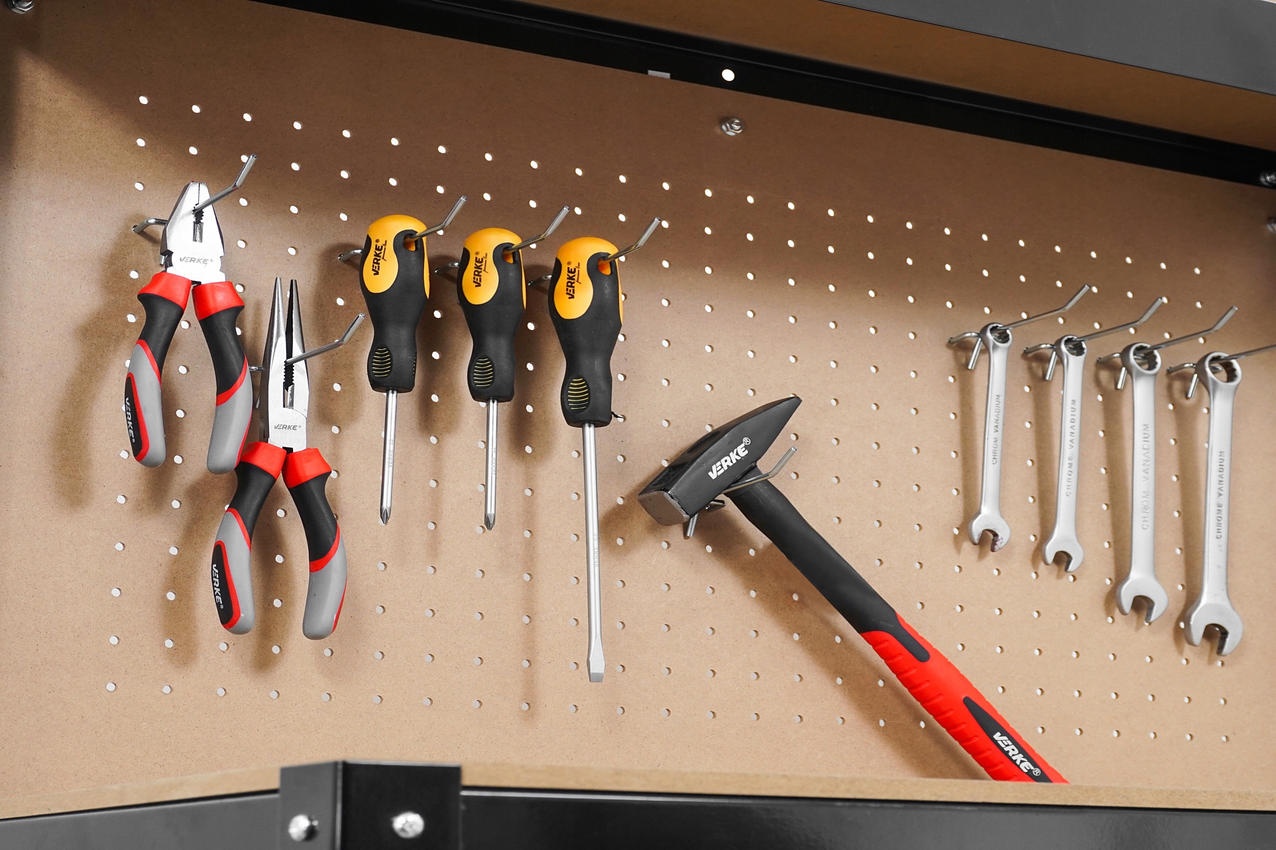 Dzięki przemyślanej konstrukcji i dodatkom, takim jak perforowana tablica, wszystkie narzędzia są zawsze na swoim miejscu, co ułatwia pracę i poprawia efektywność.