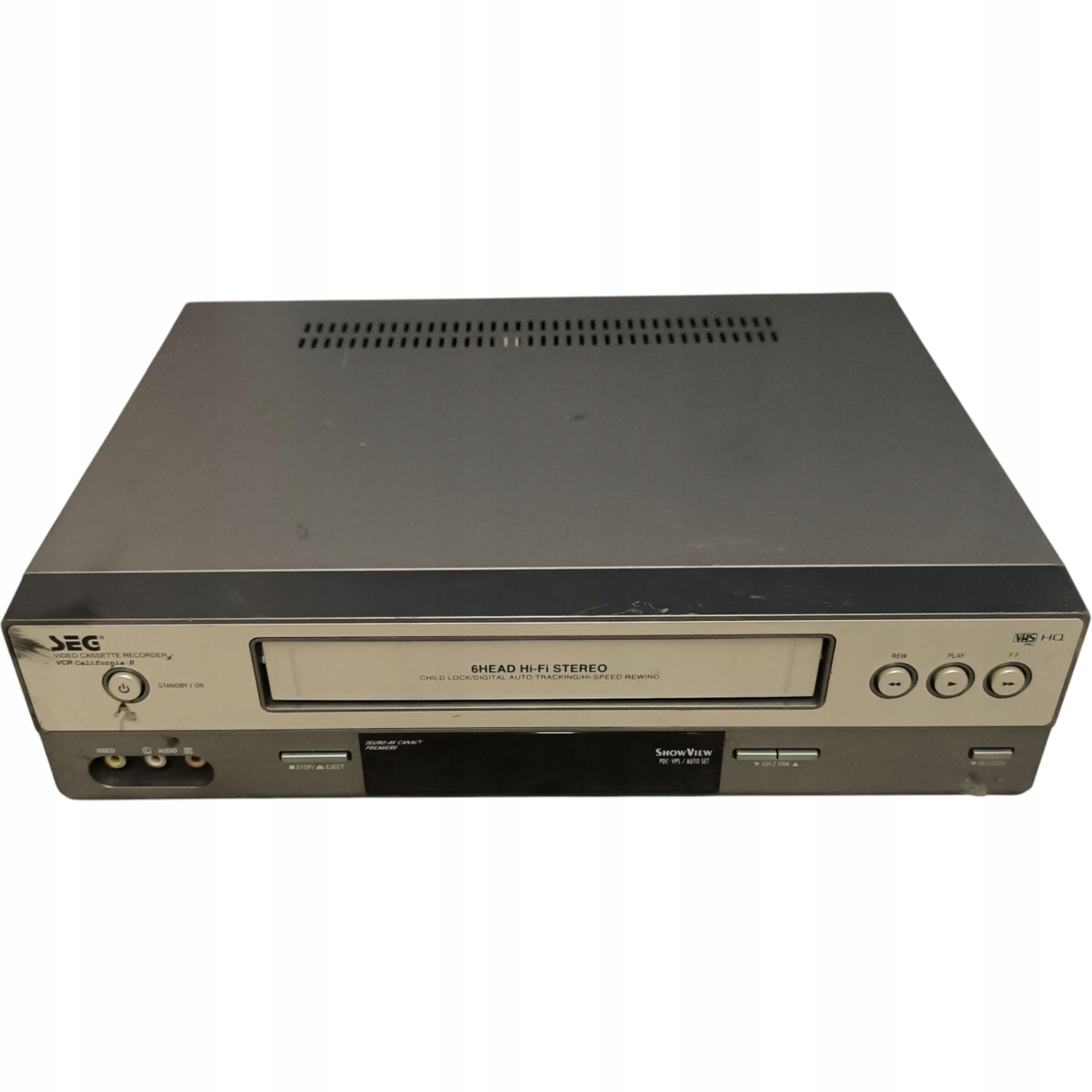 Na sprzedaż oryginalny koreański magnetowid SEG VCR California-II z systemem PAL-B/G i dźwiękiem HiFi stereo. Urządzenie nie było testowane – brak kabla zasilającego (obcięty). Sprzęt pochodzi od niemieckiego klienta, nie był sprawdzany ani uruchamiany. Obudowa z widocznymi śladami użytkowania i lekkimi zarysowaniami.
